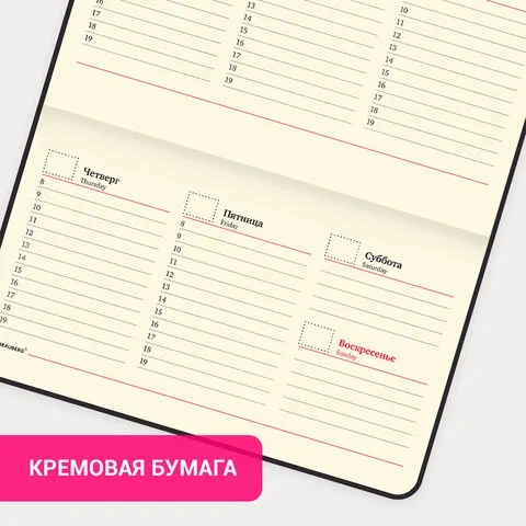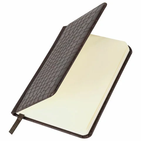 Внутренний блок содержит 72 листа офсетной бумаги кремового цвета плотностью 70 г/м2. Мягкая обложка с фактурой под кожу крокодила прошита по периметру. Подходит для горячего тиснения. Дополнением является закладка-ляссе, с помощью которой при необходимости можно быстро открыть еженедельник на нужной странице. Благодаря небольшому формату А6 (95х155 мм) его легко можно взять с собой. Имеет обширный справочный материал.