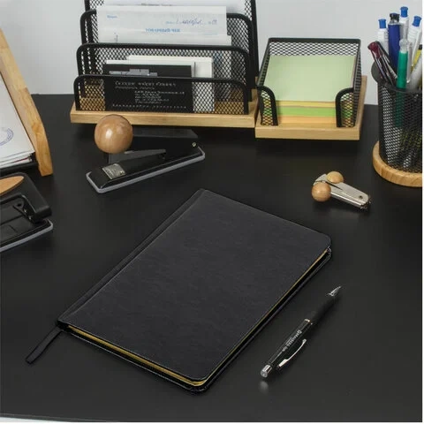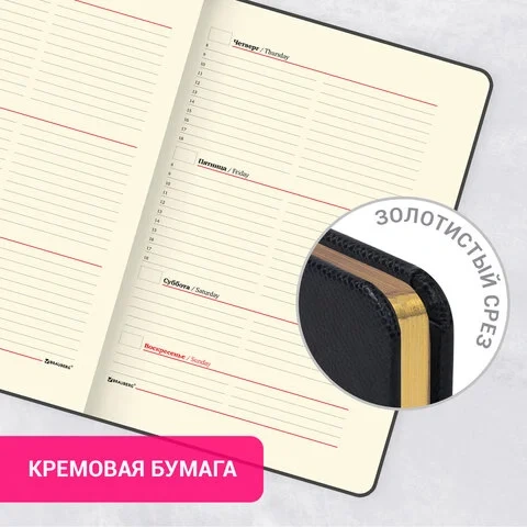 Внутренний блок включает 64 листа тонированной бумаги плотностью 70 г/м2. Благодаря стандартному формату А5 еженедельник удобно использовать как в офисе, так и на выездных деловых встречах. Твердая обложка, стилизованная под кожу рептилии, подходит для горячего тиснения. Срез еженедельника фольгирован золотой фольгой, что придает ему особый шарм. Дополнением является закладка-ляссе, с помощью которой при необходимости можно быстро открыть еженедельник на нужной странице. Помимо прочего, еженедельник снабжен обширным справочным материалом. Выполнен в классическом черном цвете.