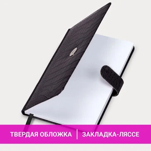 Внутренний блок включает 64 листа тонированной бумаги плотностью 70 г/м2. Благодаря стандартному формату А5 еженедельник удобно использовать как в офисе, так и на выездных деловых встречах. Твердая обложка, стилизованная под кожу крокодила, фиксируется магнитной застежкой, поэтому еженедельник не откроется в сумке или портфеле и страницы не помнутся. Подходит для горячего тиснения. Дополнением является закладка-ляссе, с помощью которой при необходимости можно быстро открыть еженедельник на нужной странице. Помимо прочего, еженедельник снабжен обширным справочным материалом. Выполнен в черном цвете.
