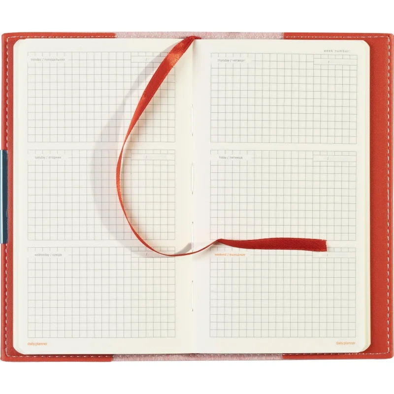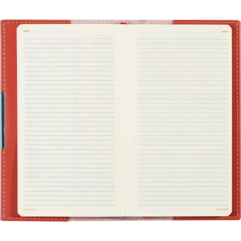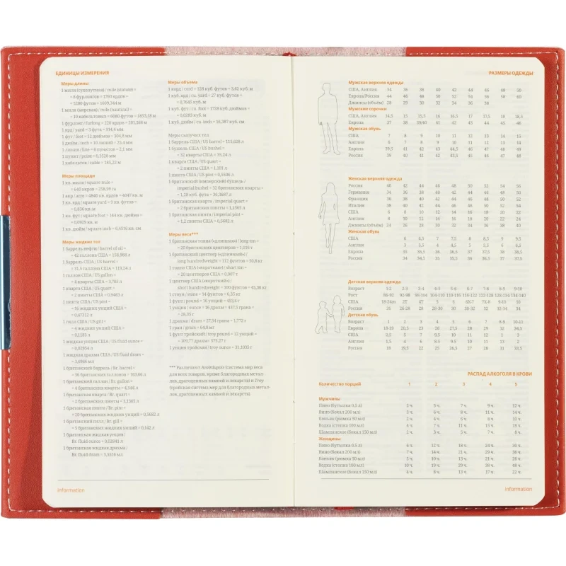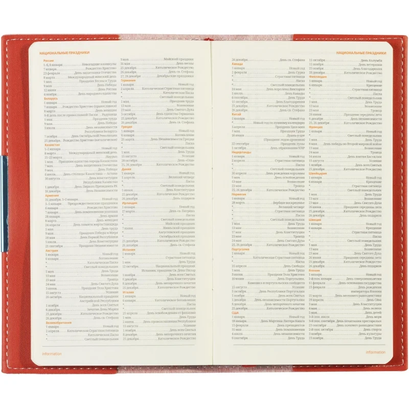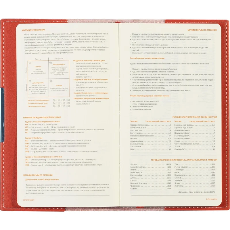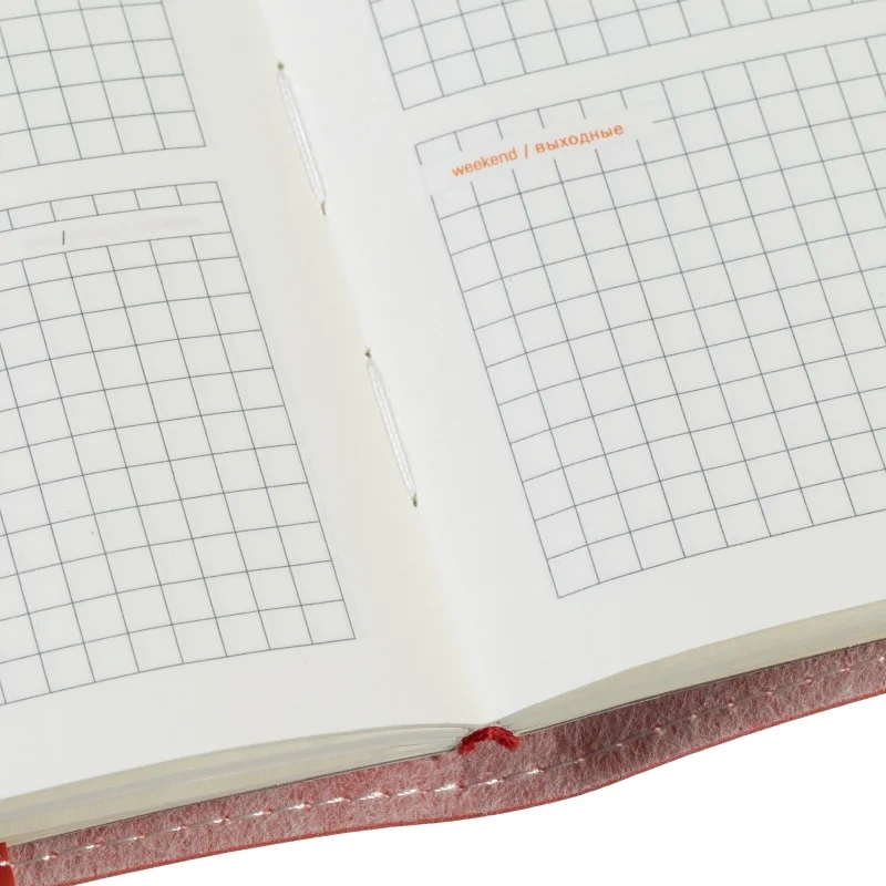 Мягкая обложка красного цвета из искусственной кожи имеет гибкую, но невероятно прочную фактуру, подходящую в том числе для тиснения. Эффектная отстрочка белыми нитками по контуру и металлический декор дополняют универсальный офисный дизайн изделия. Недатированный еженедельник компактного формата А6 состоит из 160 страниц, объединённых в сменный блок. Линовка блока — клетка, с указанием дней недели. Бумага бежевого цвета обладает высшим качеством и плотностью 70-90 г/кв. м. Информационно-справочный блок, размещённый на 18 страницах, является источником полезной информации, которая пригодится при ведении бизнеса. Карманный формат этого еженедельника позволяет эффективно вести записи на выездных совещаниях, переговорах и встречах.