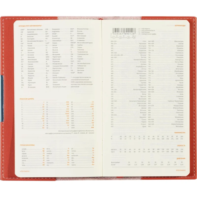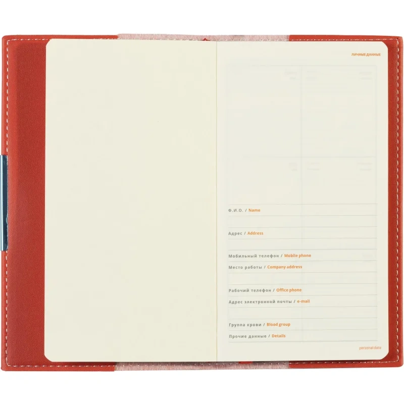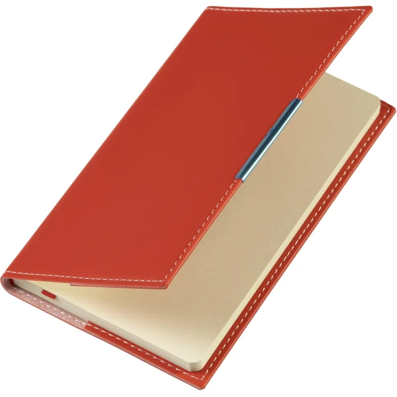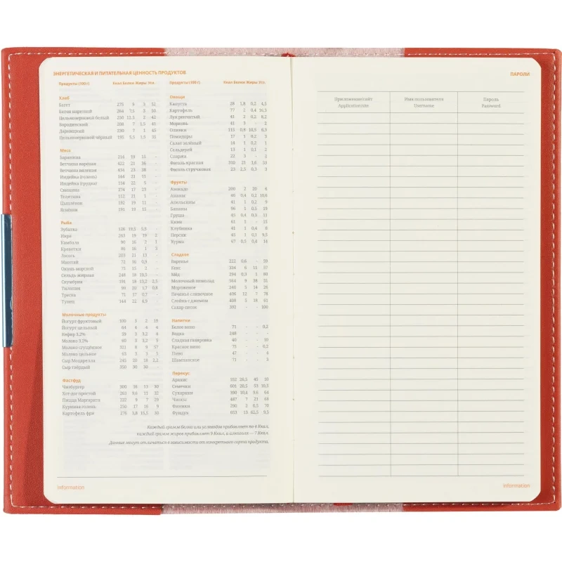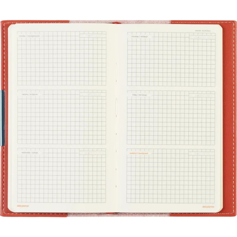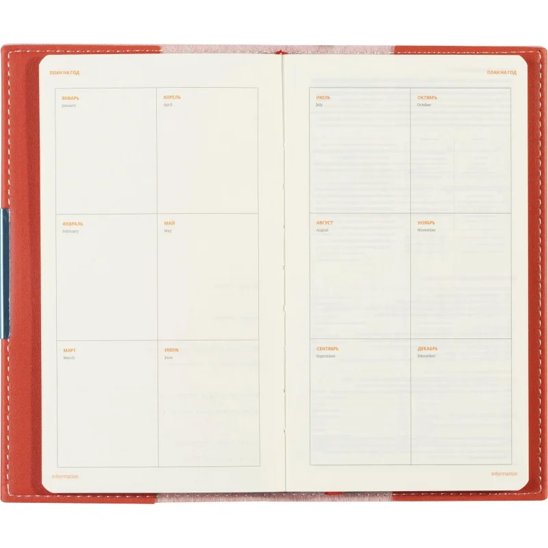 Мягкая обложка красного цвета из искусственной кожи имеет гибкую, но невероятно прочную фактуру, подходящую в том числе для тиснения. Эффектная отстрочка белыми нитками по контуру и металлический декор дополняют универсальный офисный дизайн изделия. Недатированный еженедельник компактного формата А6 состоит из 160 страниц, объединённых в сменный блок. Линовка блока — клетка, с указанием дней недели. Бумага бежевого цвета обладает высшим качеством и плотностью 70-90 г/кв. м. Информационно-справочный блок, размещённый на 18 страницах, является источником полезной информации, которая пригодится при ведении бизнеса. Карманный формат этого еженедельника позволяет эффективно вести записи на выездных совещаниях, переговорах и встречах.