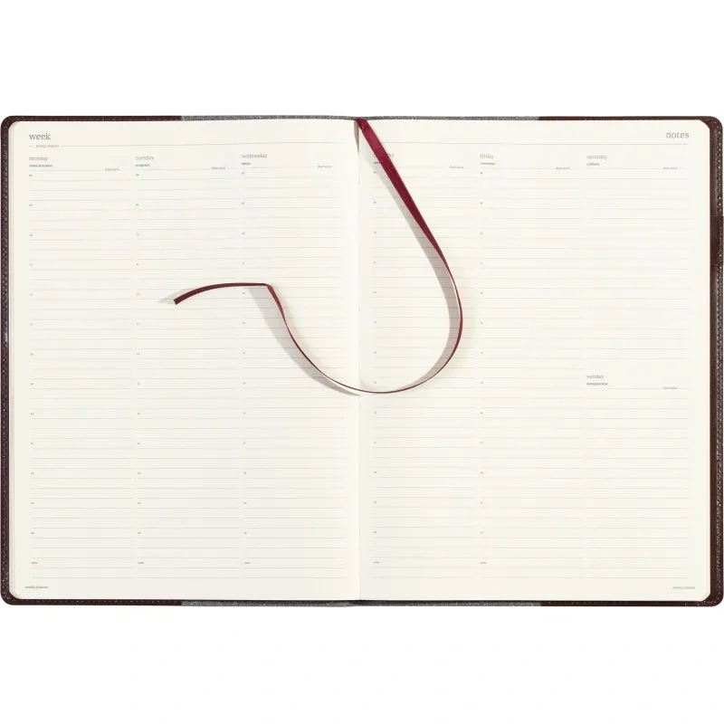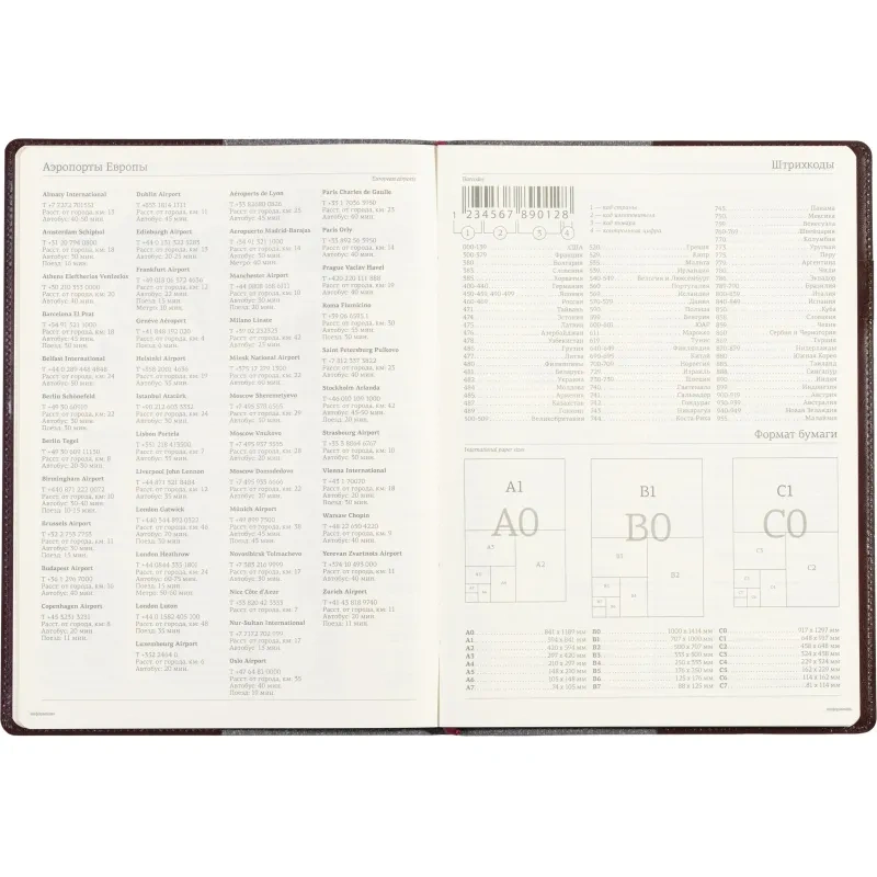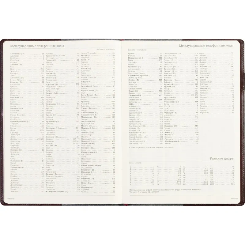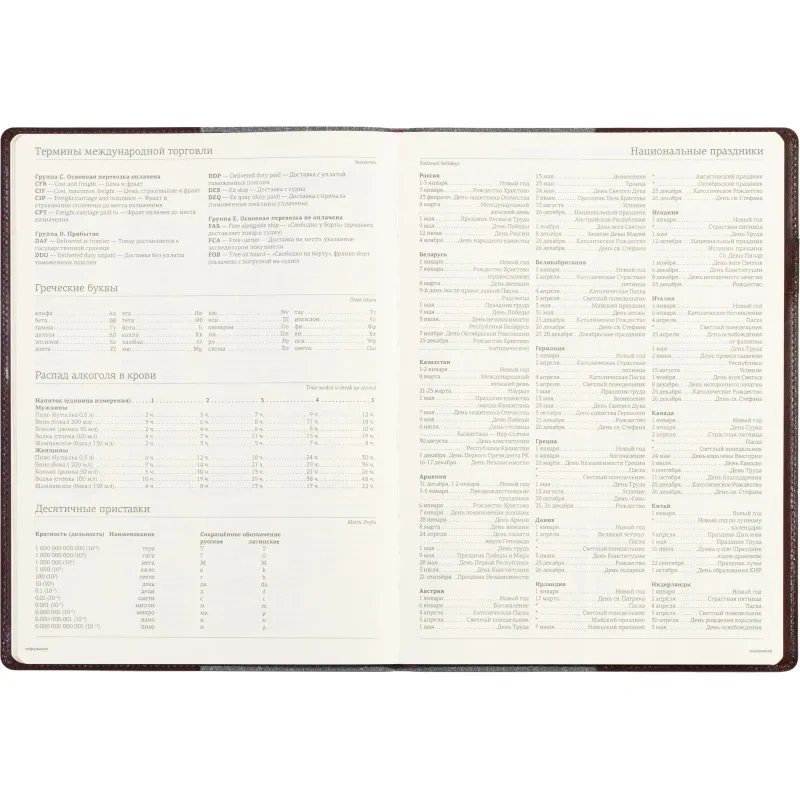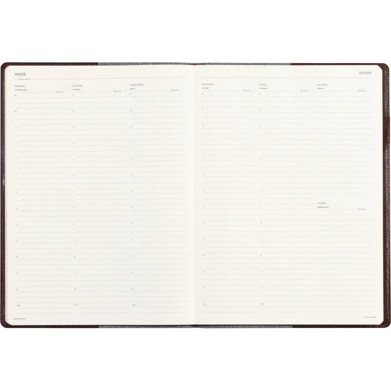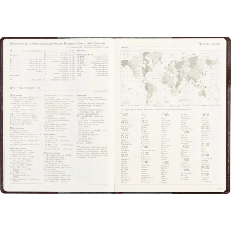 Еженедельник со сменным блоком выпускается в настольном формате А4 (размер: 210×290 мм) и состоит из 128 страниц. Для них использована бежевая бумага высшего сорта, обладающая плотностью 70-90 г/кв. м. На 18 страницах размещена справочная информация с полезными сведениями из различных областей. Под обложкой расположена кожаная петля для ручки, поэтому еженедельник удобно брать в поездки. Есть специальный карман для хранения визиток.
