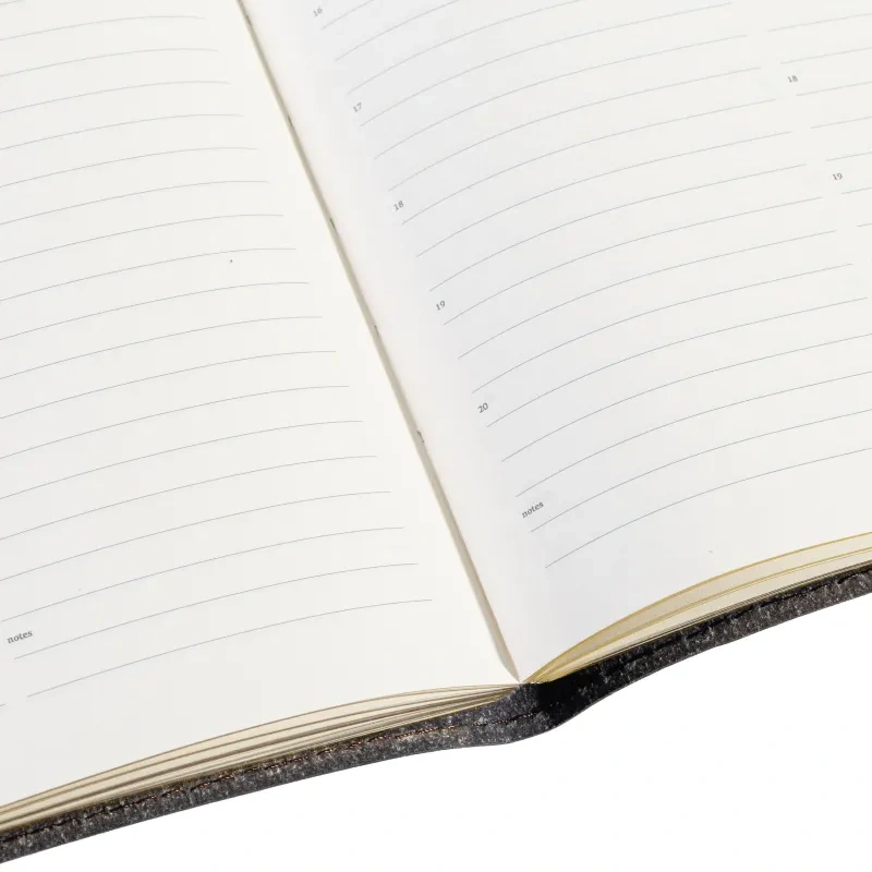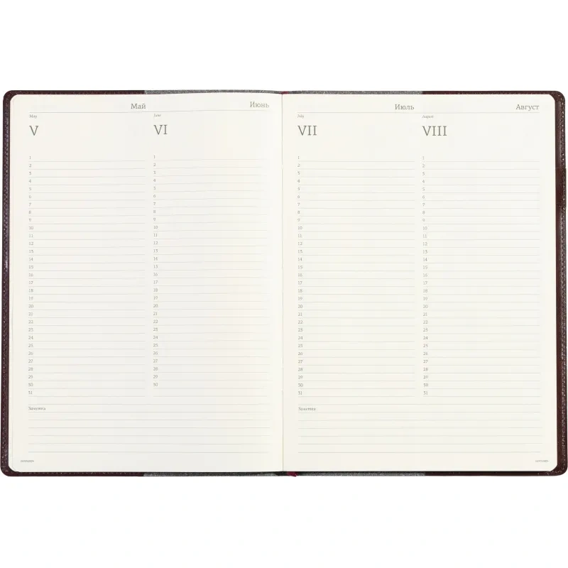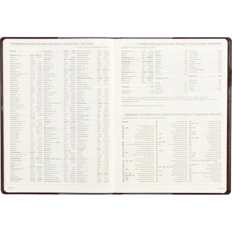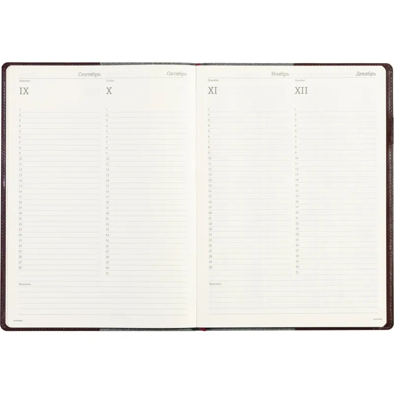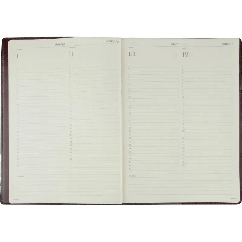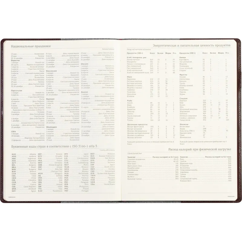 Еженедельник со сменным блоком выпускается в настольном формате А4 (размер: 210×290 мм) и состоит из 128 страниц. Для них использована бежевая бумага высшего сорта, обладающая плотностью 70-90 г/кв. м. На 18 страницах размещена справочная информация с полезными сведениями из различных областей. Под обложкой расположена кожаная петля для ручки, поэтому еженедельник удобно брать в поездки. Есть специальный карман для хранения визиток.