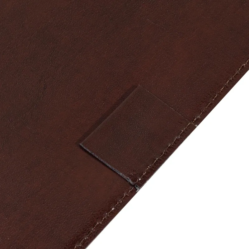 Еженедельник-портфолио серии Profy — необходимый инструмент на столе делового человека, стремящегося к карьерному и личностному росту. Мягкая обложка в универсальном офисном стиле выполнена из высококачественной рециклированной коричневой натуральной кожи, подходит для любых видов полиграфического тиснения. Матовая поверхность кожи подчёркнута золотым металлизированным обрезом. По периметру обложки проходит строчка нитками в тон.