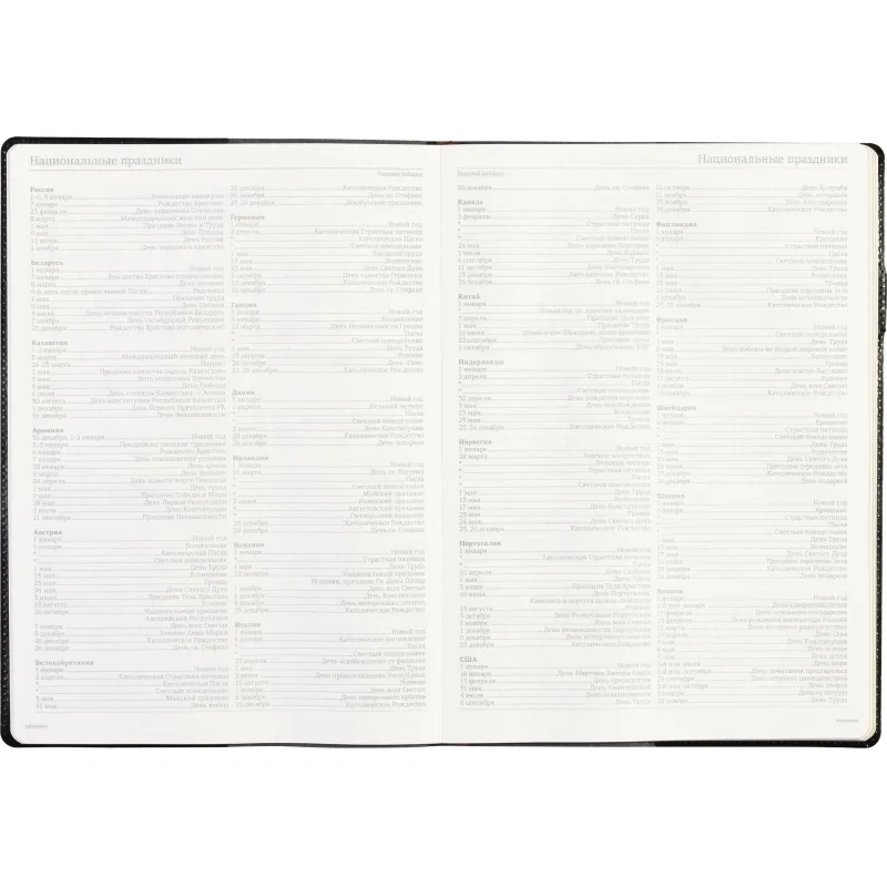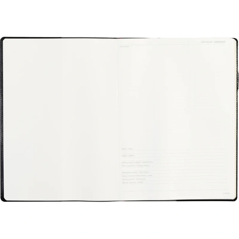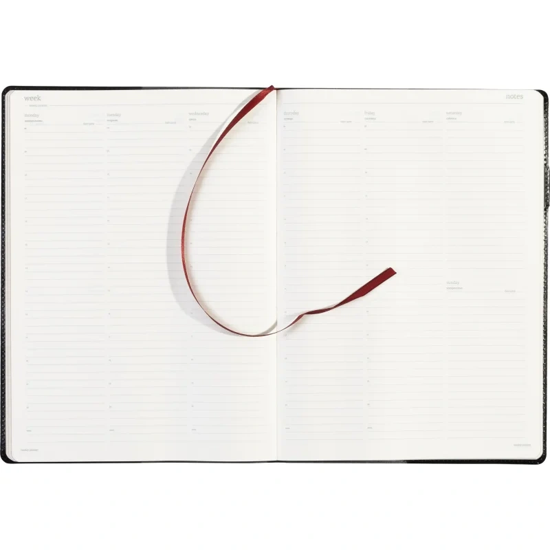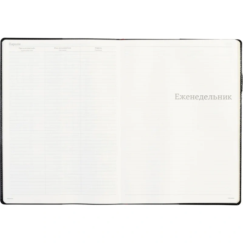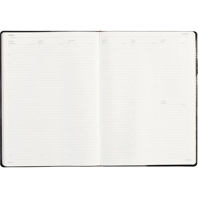 Еженедельник-портфолио серии Profy — необходимый инструмент на столе делового человека, стремящегося к карьерному и личностному росту. Обложка в универсальном офисном дизайне выполнена из высококачественной рециклированной чёрной натуральной кожи. Матовая поверхность кожи подчёркнута золотым металлизированным обрезом. По периметру обложки проходит строчка нитками в тон. Еженедельник со сменным блоком выпускается в настольном формате А4 (размер: 210×290 мм) и состоит из 128 страниц. Для них использована бежевая бумага высшего сорта, обладающая плотностью 70-90 г/кв. м. На 18 страницах размещена справочная информация с полезными сведениями из различных областей. Предусмотрена кожаная петля для ручки, поэтому еженедельник удобно брать в поездки. Для быстрого перехода по страницам под обложкой есть бордовая шёлковая закладка-ляссе.