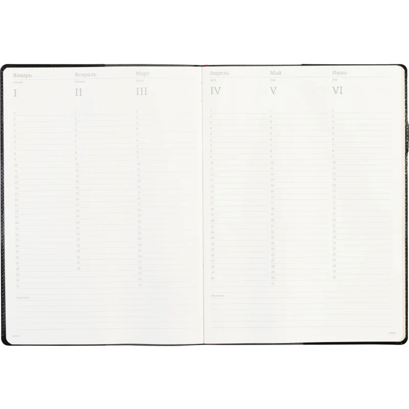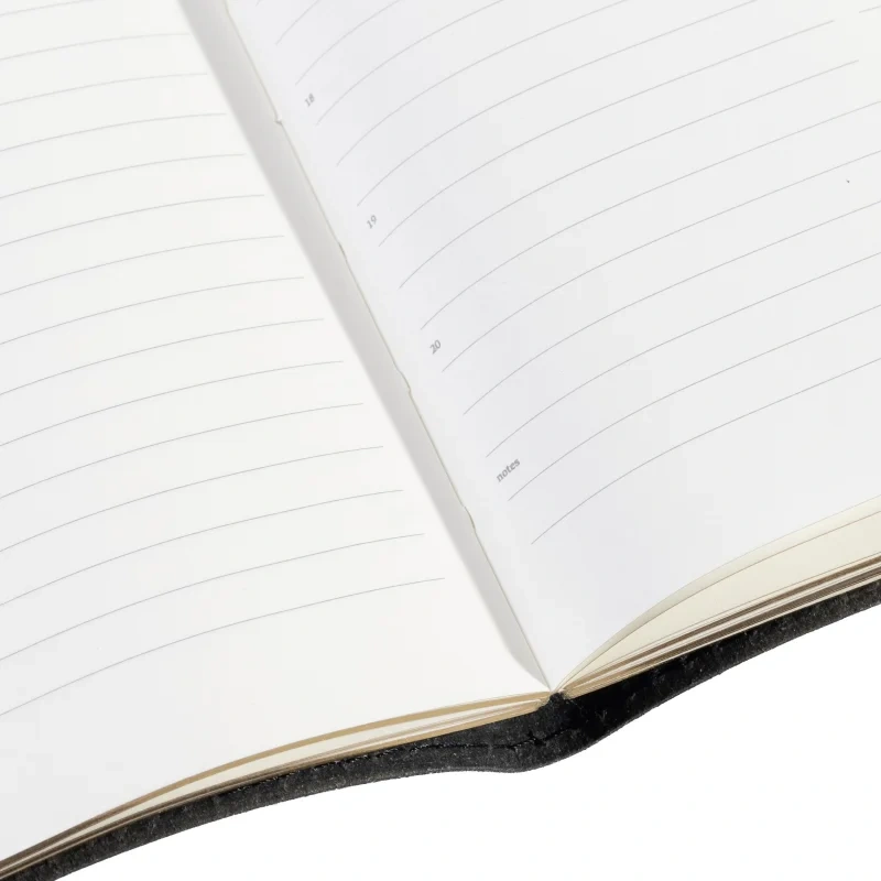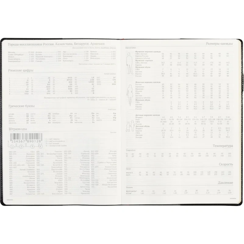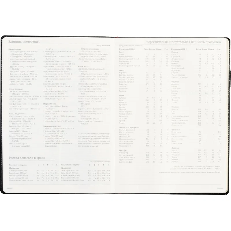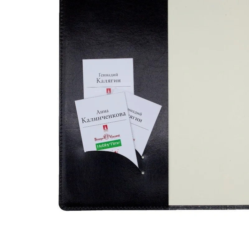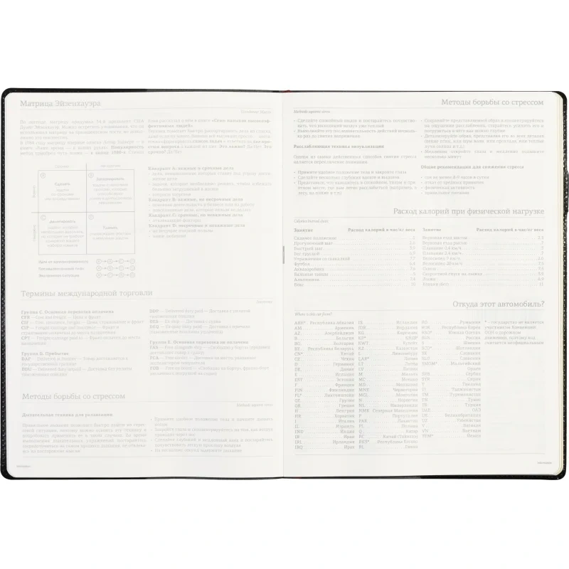 Еженедельник-портфолио серии Profy — необходимый инструмент на столе делового человека, стремящегося к карьерному и личностному росту. Обложка в универсальном офисном дизайне выполнена из высококачественной рециклированной чёрной натуральной кожи. Матовая поверхность кожи подчёркнута золотым металлизированным обрезом. По периметру обложки проходит строчка нитками в тон. Еженедельник со сменным блоком выпускается в настольном формате А4 (размер: 210×290 мм) и состоит из 128 страниц. Для них использована бежевая бумага высшего сорта, обладающая плотностью 70-90 г/кв. м. На 18 страницах размещена справочная информация с полезными сведениями из различных областей. Предусмотрена кожаная петля для ручки, поэтому еженедельник удобно брать в поездки. Для быстрого перехода по страницам под обложкой есть бордовая шёлковая закладка-ляссе.