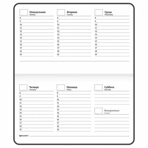 Внутренний блок содержит 64 листа офсетной бумаги белого цвета плотностью 60 г/м2. Обложка 7БЦ (твердый переплет с матовой пленкой) обеспечивает долгий срок службы. Снабжен резинкой-фиксатором, благодаря чему планинг не откроется в сумке или портфеле. Отличительная особенность – это поля, на которых можно проставить даты. Размер изделия – 171х93 мм.