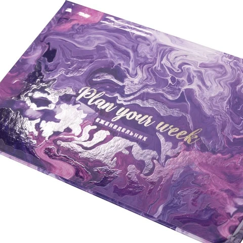 Внутренний блок содержит 64 листа офсетной бумаги белого цвета плотностью 65 г/м2. Обложка 7БЦ (твердый переплет с матовой пленкой и выборочным лаком) обеспечивает долгий срок службы. Снабжен резинкой-фиксатором, благодаря чему планинг-еженедельник не откроется в сумке или портфеле. Отличительная особенность – это поля, где можно проставить даты. Размер изделия – 171х93 мм.