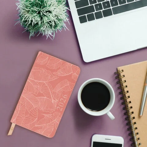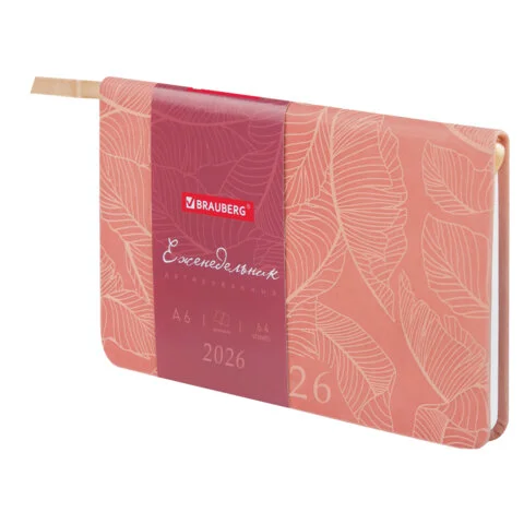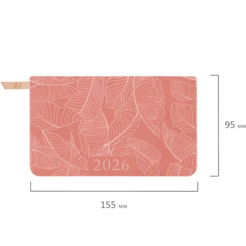 Еженедельник датированный 2026 МАЛЫЙ ФОРМАТ 95х155 мм, А6, BRAUBERG 'Foliage', под кожу, розовый, 11