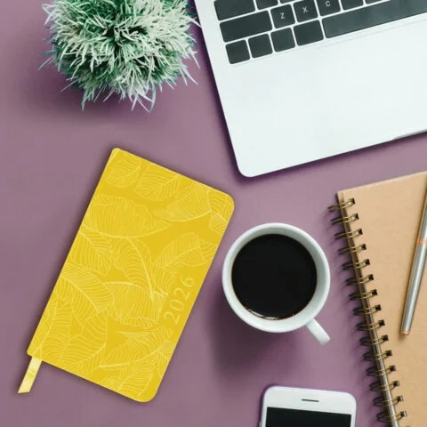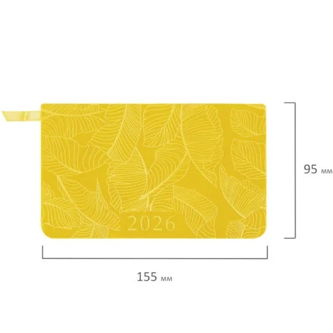 Еженедельник датированный 2026 МАЛЫЙ ФОРМАТ 95х155 мм, А6, BRAUBERG 'Foliage', под кожу, желтый, 117