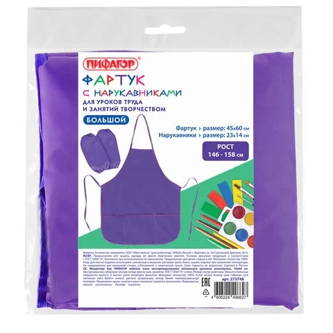 Фартук с нарукавниками для уроков труда ПИФАГОР, 3 кармана, увеличенный размер, 45x60 см, фиолетовый