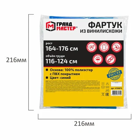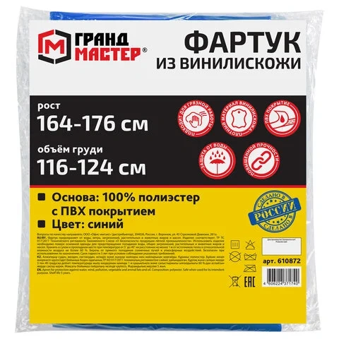 Фартук защитный из винилискожи КЩС, объем груди 116-124, рост 164-176, синий, ГРАНДМАСТЕР, 610872