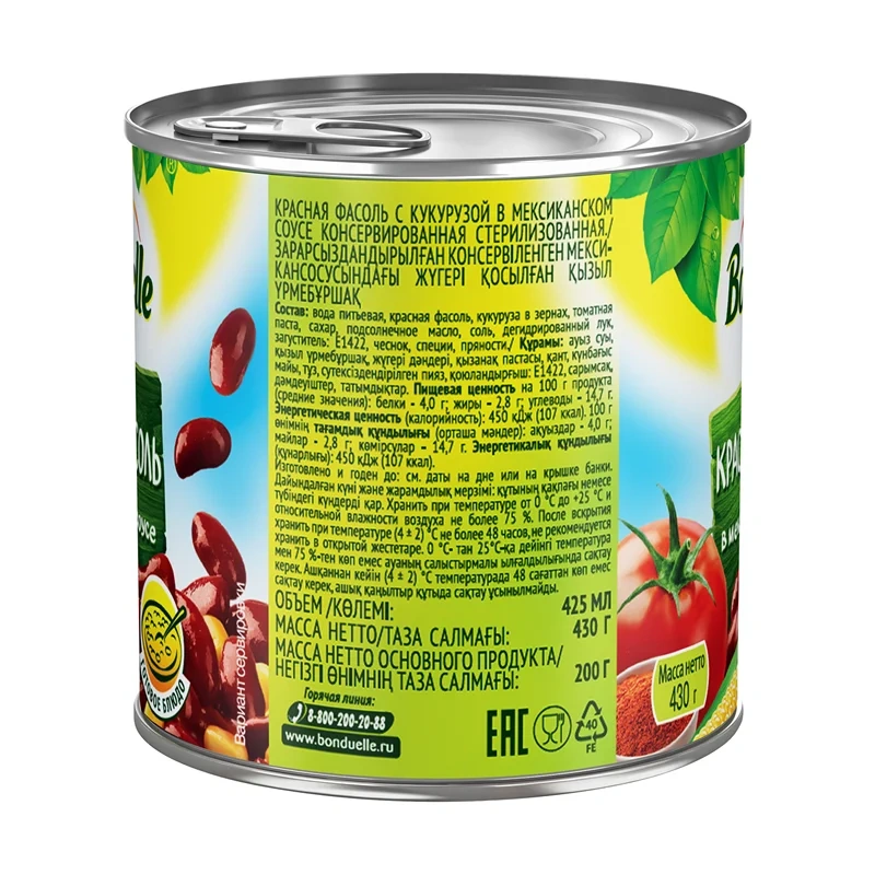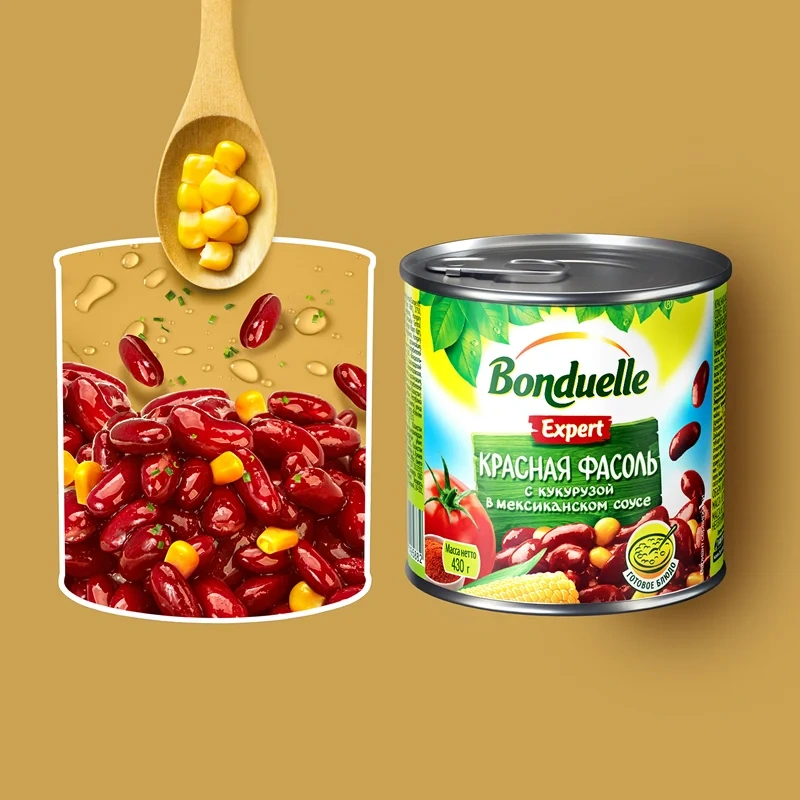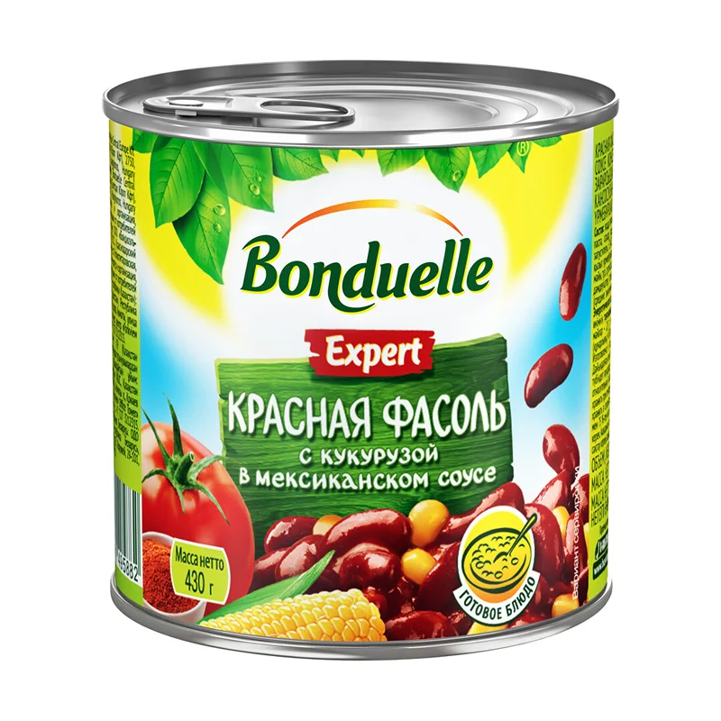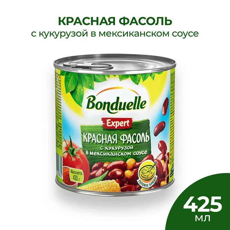 Оригинальная смесь из красной фасоли и сочной кукурузы в пикантном соусе с ароматными специями - это и самостоятельное блюдо, и великолепная основа для гарниров, супов, закусок и горячего. Подайте ее к жареным ребрышкам или мясу на гриле, сделайте буррито или кесадилью, томатный суп или овощное рагу. Продукт не содержит ГМО. Упакован в жестяную банку с ключом на крышке.