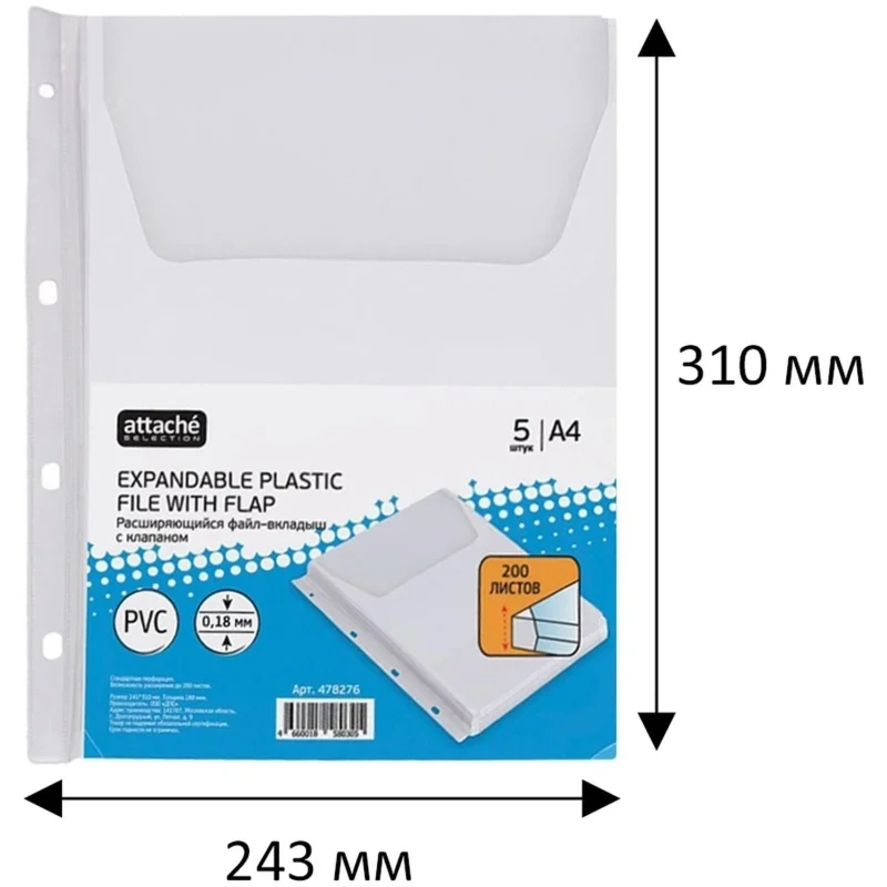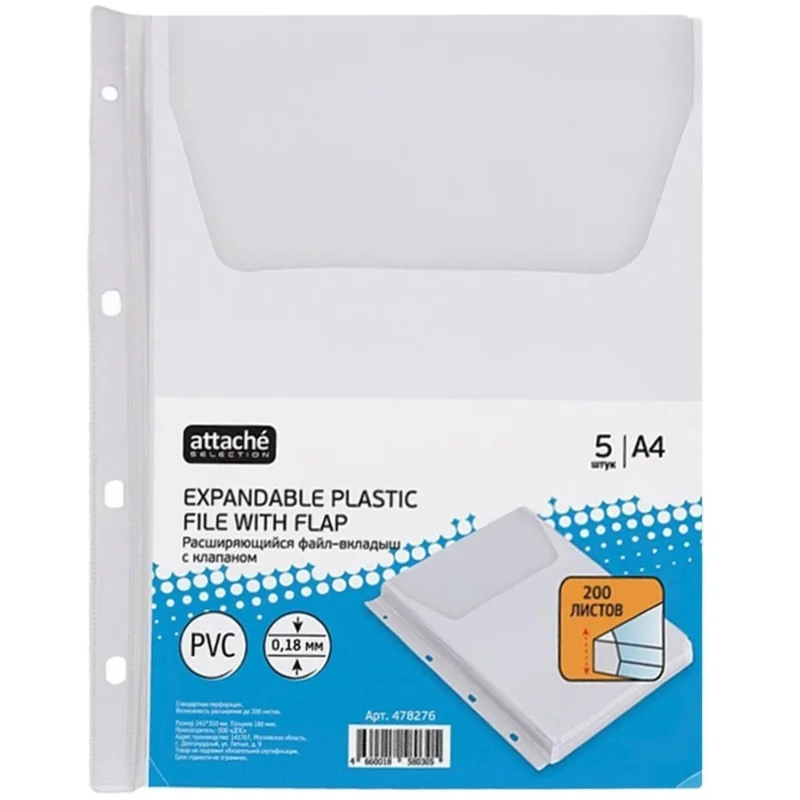 Файл-карман А4 с расширением Attache 180 мкм, 5шт/уп, с клапаном