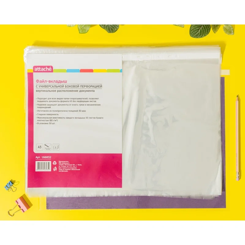 Файл-вкладыш Attache формата А3 предназначен для хранения и защиты документов. Ориентирован вертикально. Изготовлен из полипропиленовой пленки (толщина 30 мкм). Внешний размер: 320+2×425+2 мм, внутренний размер: 304,5+2×423 +2 мм. Поверхность глянцевая, прозрачная. Боковая универсальная перфорация подходит для разных типов скоросшивателей. В упаковке содержится 50 вертикальных файлов формата А3. Каждый файл-вкладыш вмещает до 30 листов стандартной плотности. Стоимость указана за упаковку. В рамках обновления дизайна упаковки с сохранением всех потребительских характеристик товара, допускается поставка данной продукции в двух вариантах дизайна упаковки.