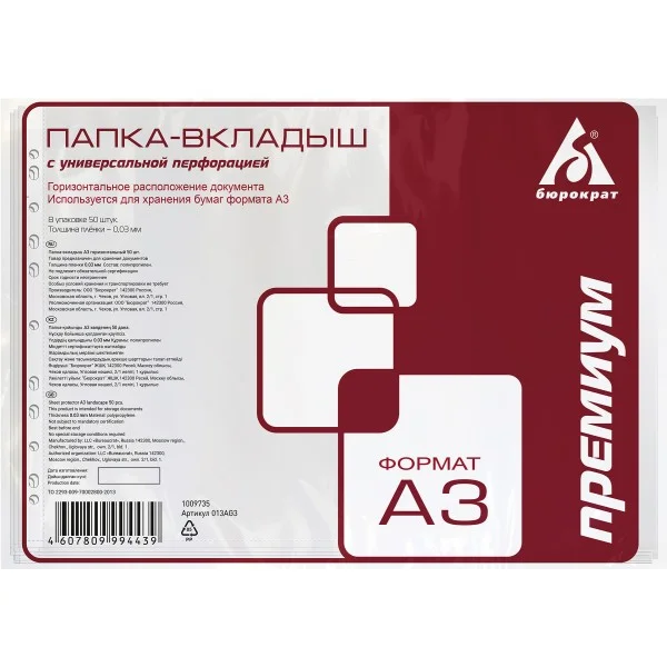 Файл-вкладыш А3 Бюрократ Премиум глянцевый, горизонтальный, 30 мкм, 50шт/уп, 013AG3