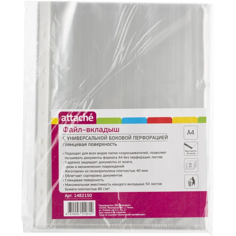 Файл-вкладыш Attache формата А4 предназначен для хранения и защиты печатных документов. Поверхность прозрачная, глянцевая. Изготовлен из полипропиленовой пленки (толщина 40 мкм). Боковая перфорация подходит для разных типов скоросшивателей. В упаковке содержится 50 файлов. Каждый файл-вкладыш вмещает около 50 листов стандартной плотности.