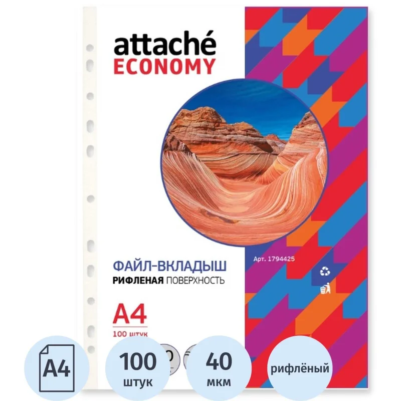 Файл-вкладыш Attache Economy формата А4, предназначенный для хранения и защиты печатных документов. Поверхность рифленая. Изготовлен из полипропиленовой пленки (толщина 40 мкм). Внутренний размер 220х330 мм +- 2мм. В упаковке содержится 100 файлов. Каждый файл-вкладыш вмещает до 50 листов стандартной плотности.