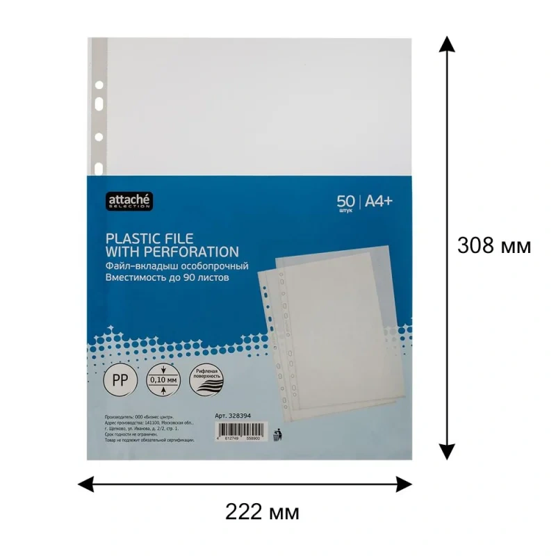 Файл-вкладыш Attache Selection формата А4 предназначен для хранения и защиты документов. Изготовлен из полипропиленовой пленки (толщина 100 мкм). Внутренний размер 308x222 мм. Имеет прозрачную рифленую поверхность. Позволяет копировать документы, не вынимая их из папки. Боковая универсальная перфорация подходит для разных типов скоросшивателей. В упаковке содержится 50 файлов. Каждый файл-вкладыш вмещает до 90 листов стандартной плотности. Стоимость указана за упаковку. В рамках обновления дизайна упаковки с сохранением всех потребительских характеристик товара, допускается поставка данной продукции в двух вариантах дизайна упаковки.