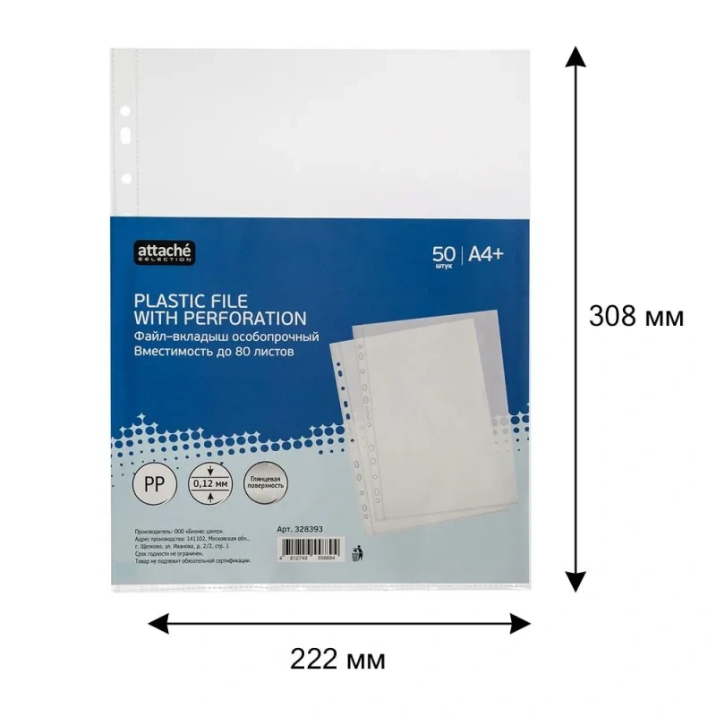 Файл-вкладыш Attache Selection формата А4 предназначен для хранения и защиты документов. Изготовлен из полипропиленовой пленки (толщина 120 мкм). Внутренний размер 308x222 мм. Имеет прозрачную глянцевую поверхность. Боковая универсальная перфорация подходит для разных типов скоросшивателей. В упаковке содержится 50 файлов. Каждыйфайл-вкладыш вмещает до 80 листов стандартной плотности. Стоимость указана за упаковку. Полоса перфорации прозрачная. В рамках обновления дизайна упаковки с сохранением всех потребительских характеристик товара, допускается поставка данной продукции в двух вариантах дизайна упаковки.