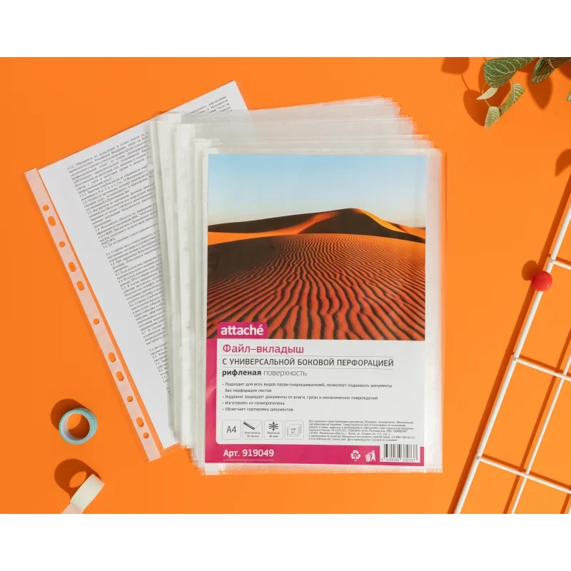 Файл-вкладыш Attache формата А4, предназначенный для хранения и защиты печатных документов. Поверхность прозрачная, рифленая. Изготовлен из полипропиленовой пленки (толщина 40 мкм). Внешний размер: 233±2×305±2 мм, внутренний размер: 217±2×303±2 мм. Боковая перфорация подходит для разных типов скоросшивателей. В упаковке содержится 100 файлов. Каждый файл-вкладыш вмещает около 50 листов стандартной плотности. Стоимость указана за упаковку.В рамках обновления дизайна упаковки с сохранением всех потребительских характеристик товара, допускается поставка данной продукции в двух вариантах дизайна упаковки.