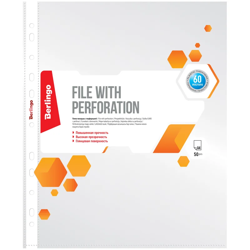 Глянцевые прозрачные папки-вкладыши Berlingo имеют универсальную перфорацию для хранения документов формата А4 в любых папках. Толщина плёнки: 60 мкм, вместимость файла: 60 листов, размер: 305*235 мм. На боковой ленте представлен логотип бренда. В упаковке 50 шт.