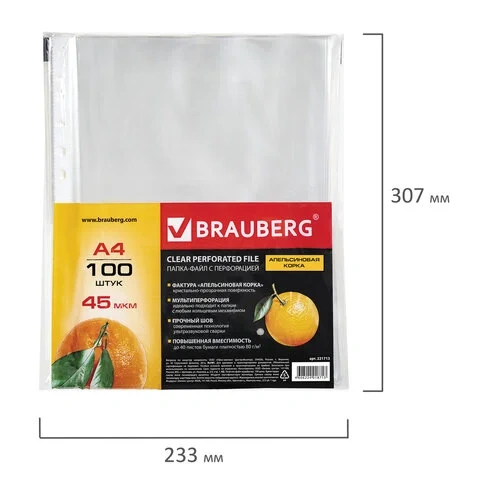 Файл-вкладыш А4 Brauberg прозрачный, 45 мкм, 100шт/уп, апельсиновая корка