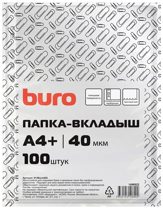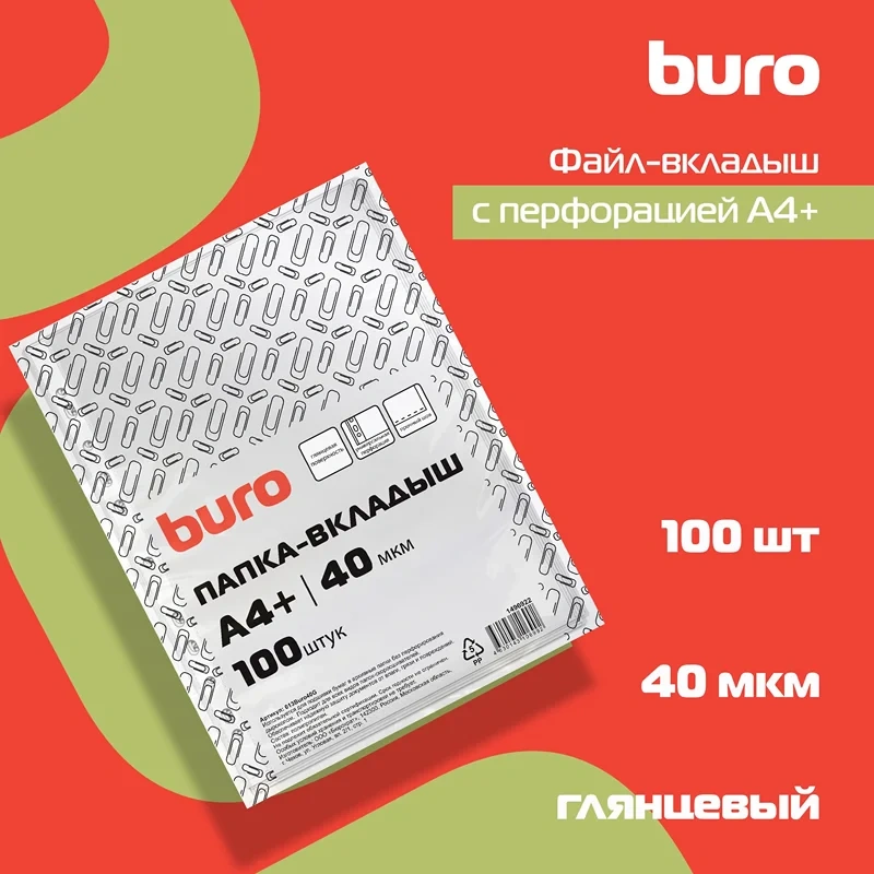 Файл-вкладыш А4 Buro глянцевый, 40мкм, 100шт/уп