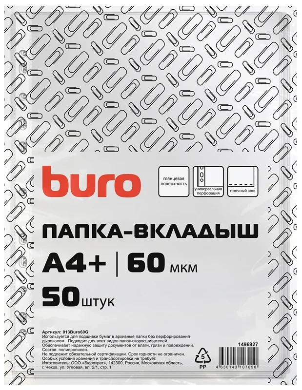 Файл-вкладыш А4 Buro глянцевый, 60мкм, 50шт/уп