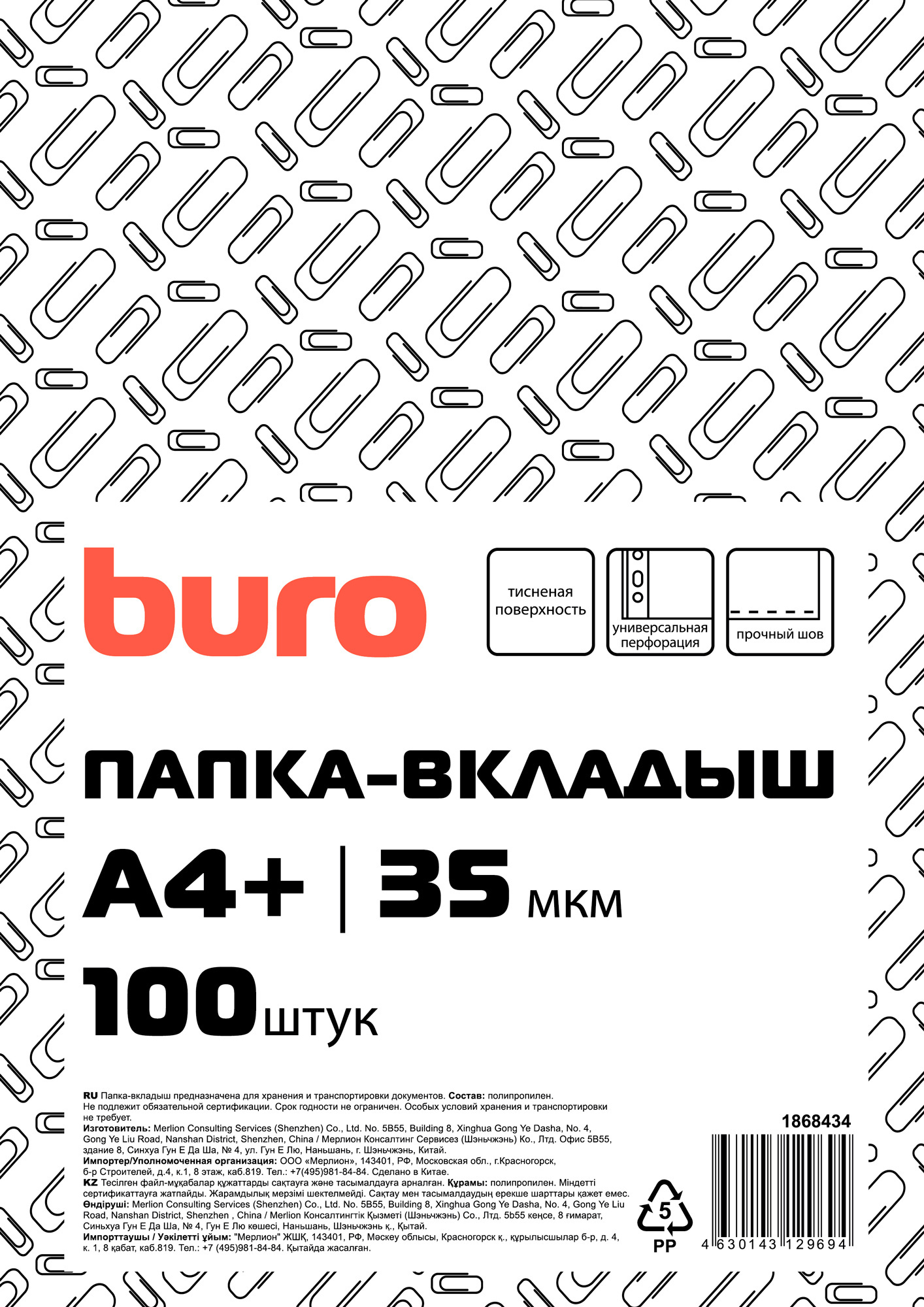 Файл-вкладыш А4 Buro тисненый, 35мкм, 100шт/уп