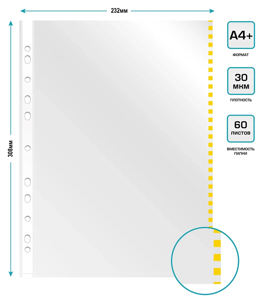 Файл-вкладыш А4+ Бюрократ Премиум желтый край глянцевый, 30 мкм, 50шт/уп