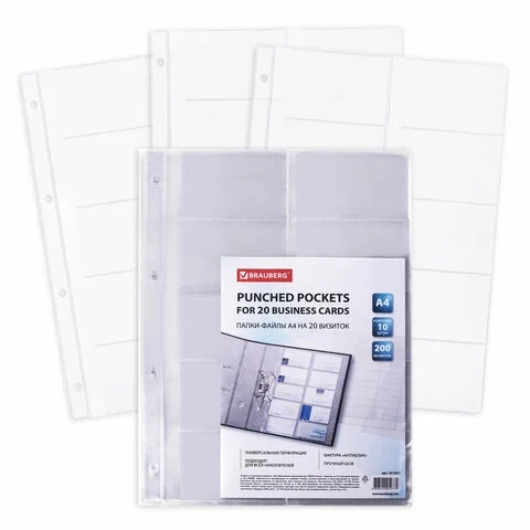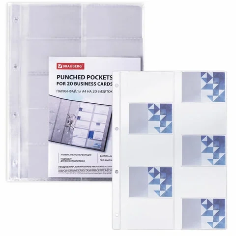 Файл-вкладыш А4 для визитных карточек Brauberg до 20 визиток, прозрачный, 10 шт./уп, ПВХ