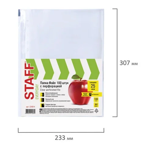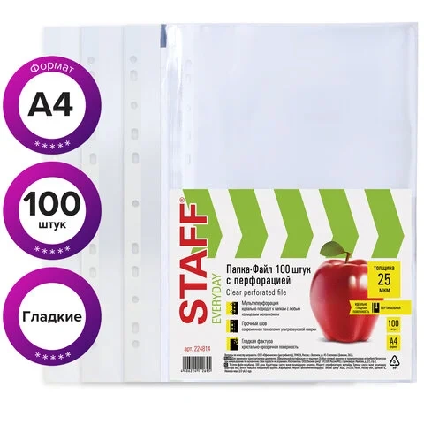 Благодаря комплекту из 100 штук проблема нехватки файлов в офисе или дома будет устранена. Покупайте товары для офиса STAFF по доступной цене в нашем интернет-магазине!