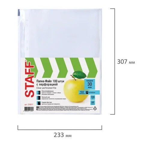 Файл-вкладыш А4 Staff глянцевый, 30 мкм, 100шт, Яблоко