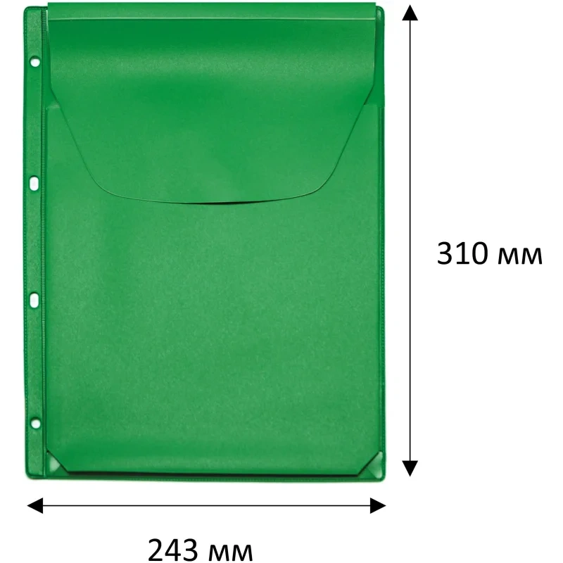 Папка файл-вкладыш расширяющийся с клапаном под А4 формат. Габаритные размеры 243×310 мм. Расширение до 2,5 см (250 листов). Стандартная перфорация позволяет подшивать файл-вкладыш в любые папки-регистраторы. Выполнен из плотного ПВХ (300мкм), который надежно защищает документы от повреждений. Упаковка — полиэтиленовый пакет с липким слоем. В упаковке три файла-вкладыша разных цветов (синий, зеленый и желтый).