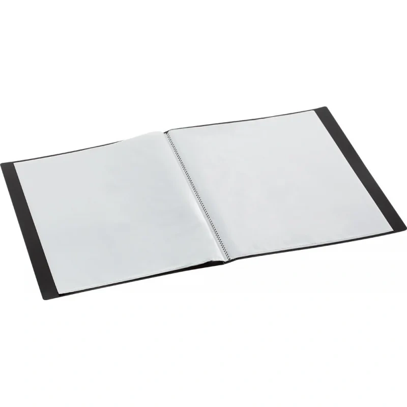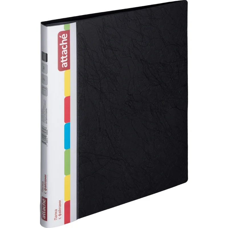 Файловая папка Attache формата А4 изготовлена из пластика (0,7 мм) черного цвета. Имеет 20 несъемных прозрачных вкладышей для удобного хранения и демонстрации документов. Ширина корешка составляет 15 мм. На корешке — карман для сменной этикетки. Папка с файлами вмещает до 40 листов (по два листа в каждом). Плотность файлов 25 мкм.