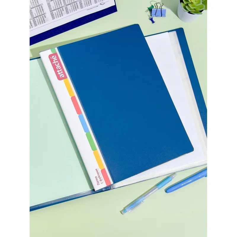 Папка с файлами Attache предназначена для хранения материалов и документов формата А4, требующих упорядоченности и наглядного обзора: отчетов, презентаций, коммерческих и персональных портфолио. Изготовлена из пластика толщиной 0,7 мм синего цвета, имеет 40 прозрачных вкладышей, а также карман на корешке для сменной этикетки. Вмещает до 80 листов стандартной плотности. Преимуществом файловой папки является надежная сохранность документов в отличном состоянии без предварительной перфорации. Плотность файлов 25 мкм.