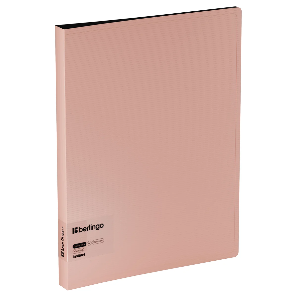 Папка Berlingo Instinct формата А4 содержит 40 вкладышей, которые надёжно защищают листы от повреждений. Листы-карманы увеличенной толщины 30мкм надежно скреплены сваркой. Размер изделия: 310*235*24 мм, ширина корешка: 24 мм, толщина материала: 700 мкм. Насыщенный пастельный розовый цвет внешней стороны в сочетании с фактурой 'горизонтальные линии', черный цвет внутренней поверхности. На внутренней стороне обложки оснащена плотным прозрачным карманом для удобного хранения мелочей: ручки, заметок, визиток, дисков, флешек и др. Папка вмещает до 100 бумажных листов. Упакована в индивидуальный прозрачный пакет