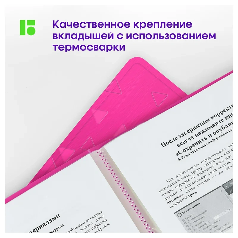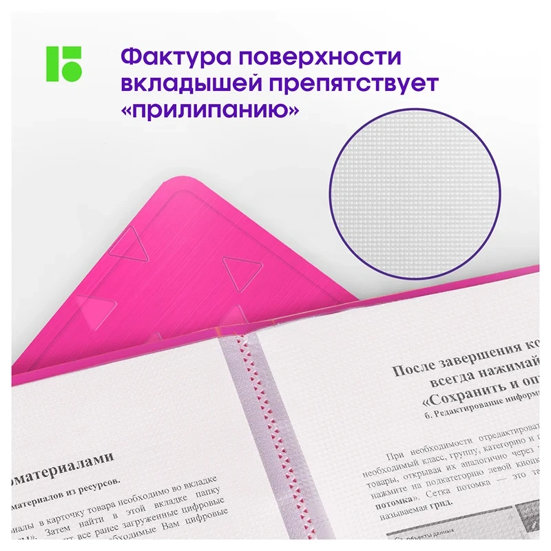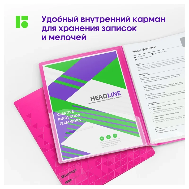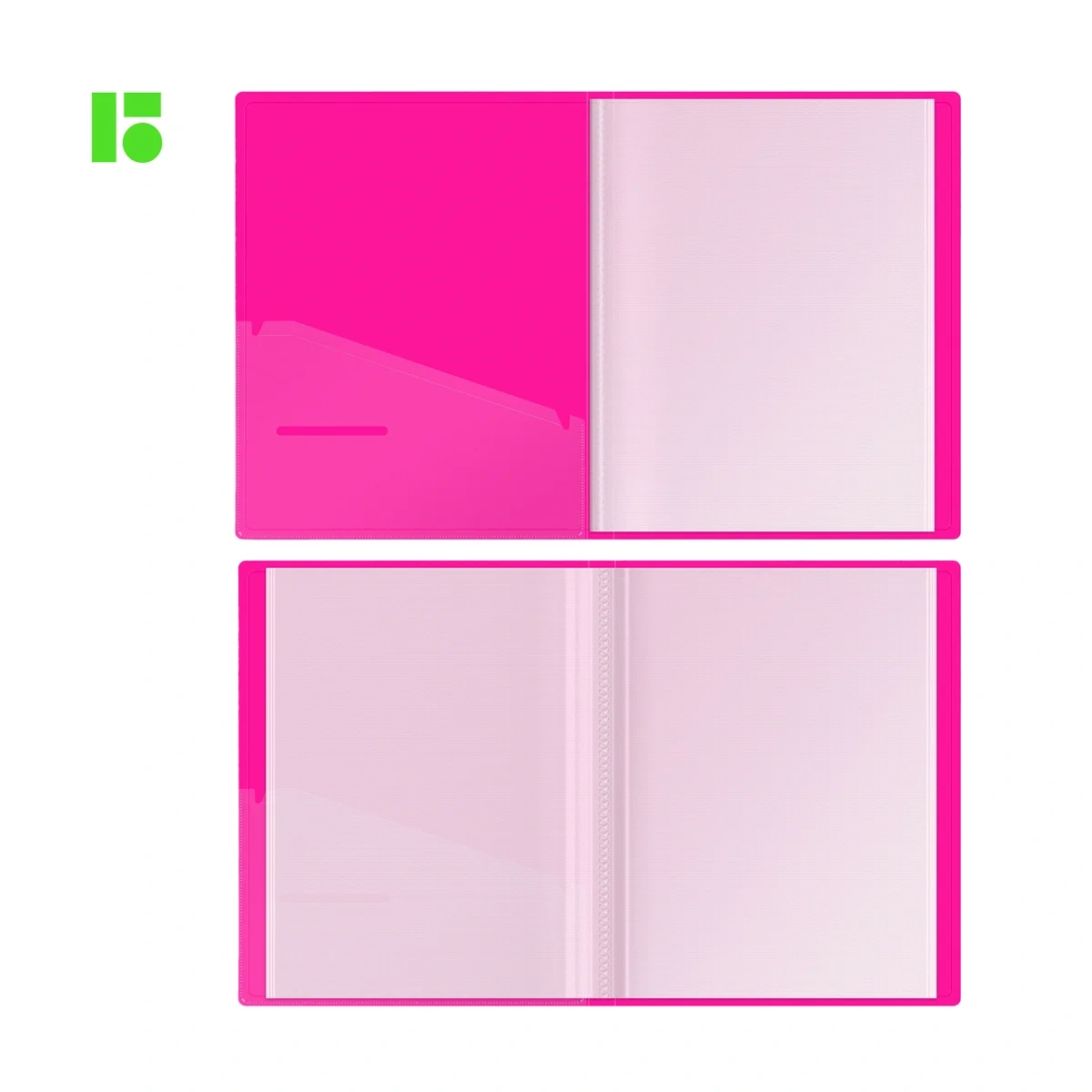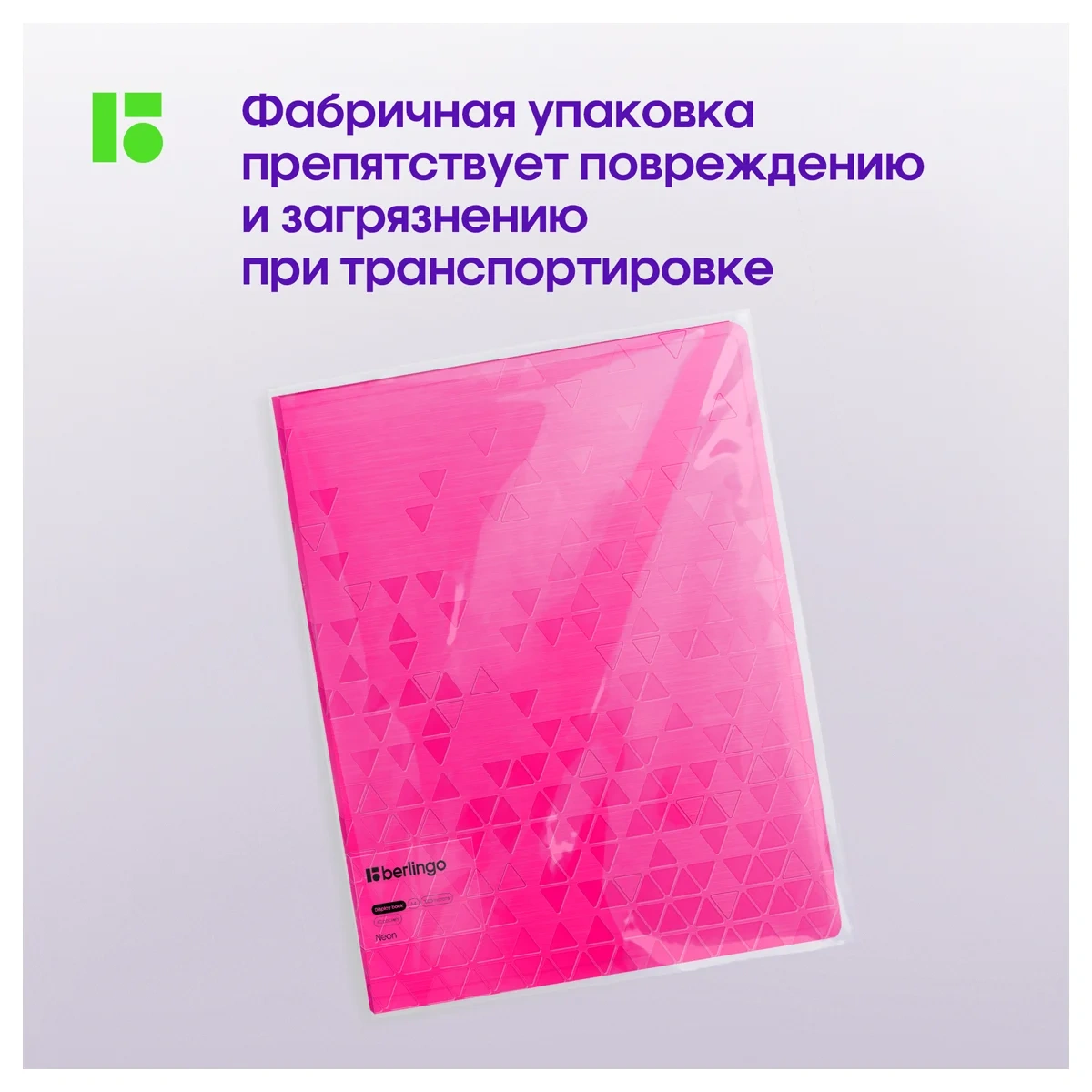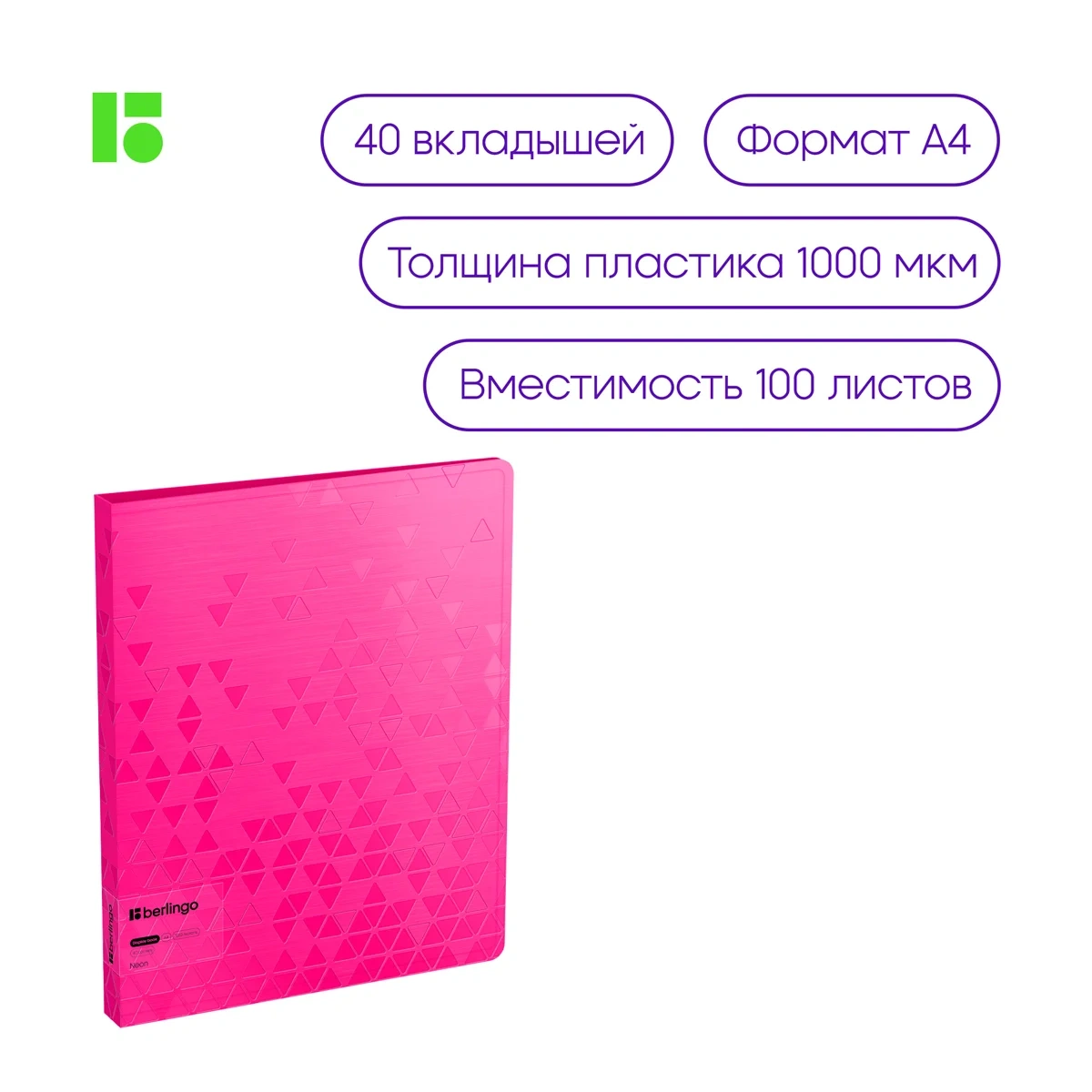 Папка Berlingo Neon с 40 вкладышами формата А4 станет ярким помощником для хранения документов. Размер изделия – 310*235*24 мм, ширина корешка – 24 мм, толщина материала – 1000 мкм. Папка вмещает до 100 бумажных листов. Листы-карманы увеличенной толщины 30 мкм надежно скреплены сваркой. Папка неонового розового цвета изготовлена из высококачественного полипропилена с матовой текстурой поверхности «рельефные треугольники», на которой не видно отпечатков пальцев и мелких царапин. Внутренняя сторона оснащена плотным прозрачным карманом для удобного хранения мелочей: ручки, заметок, визиток, дисков, флешек и другого. Упакована в индивидуальный прозрачный пакет