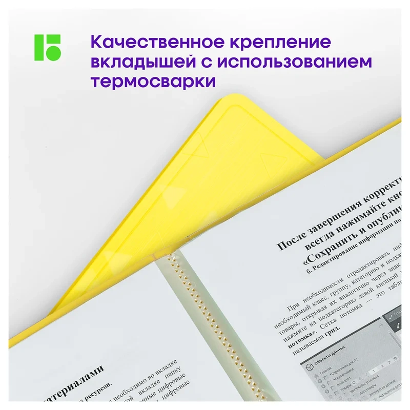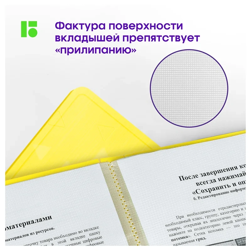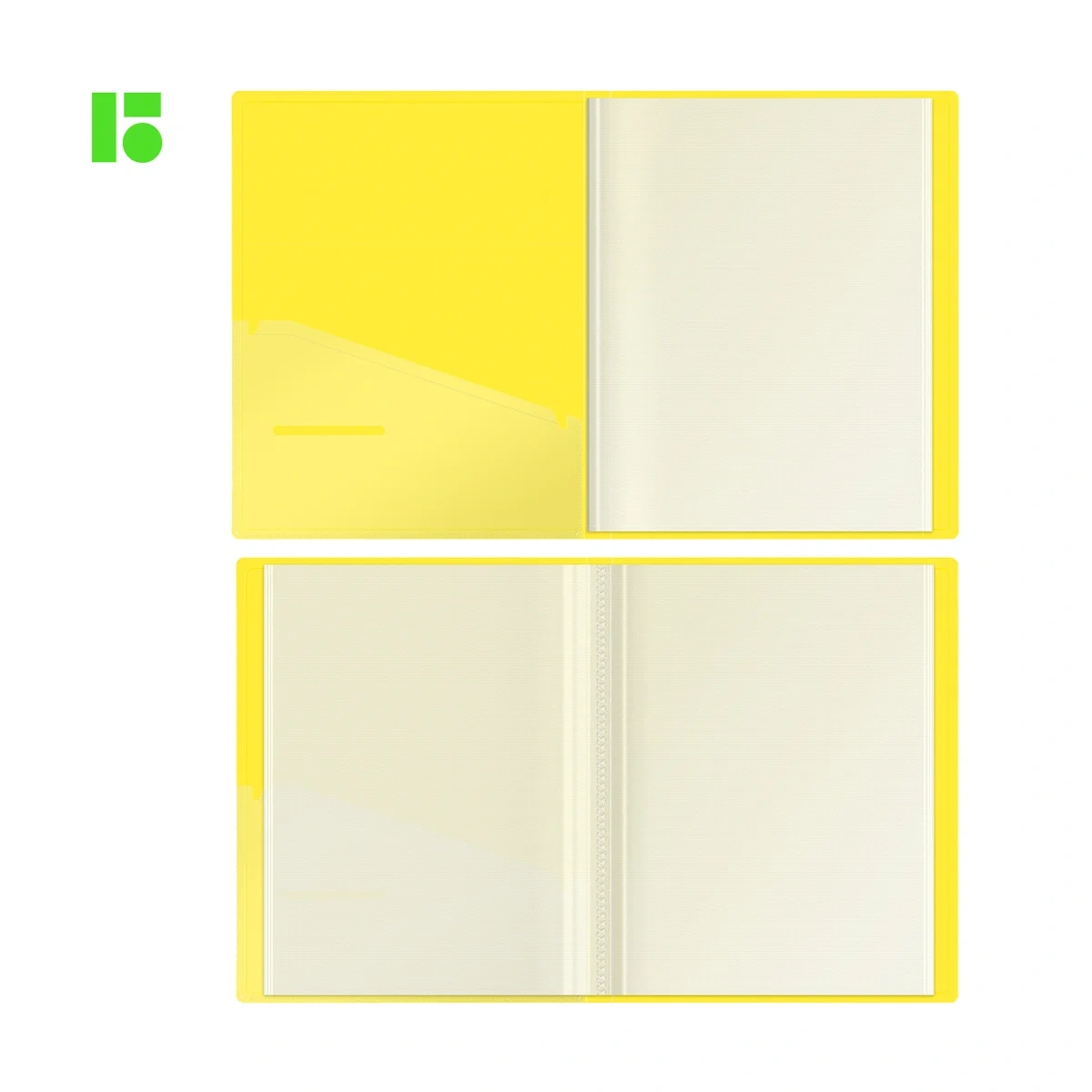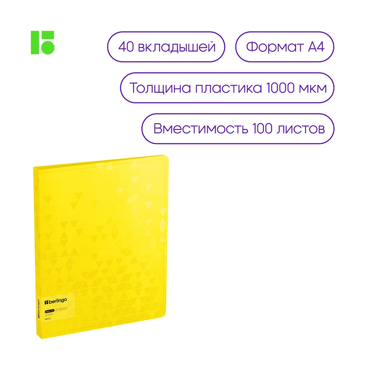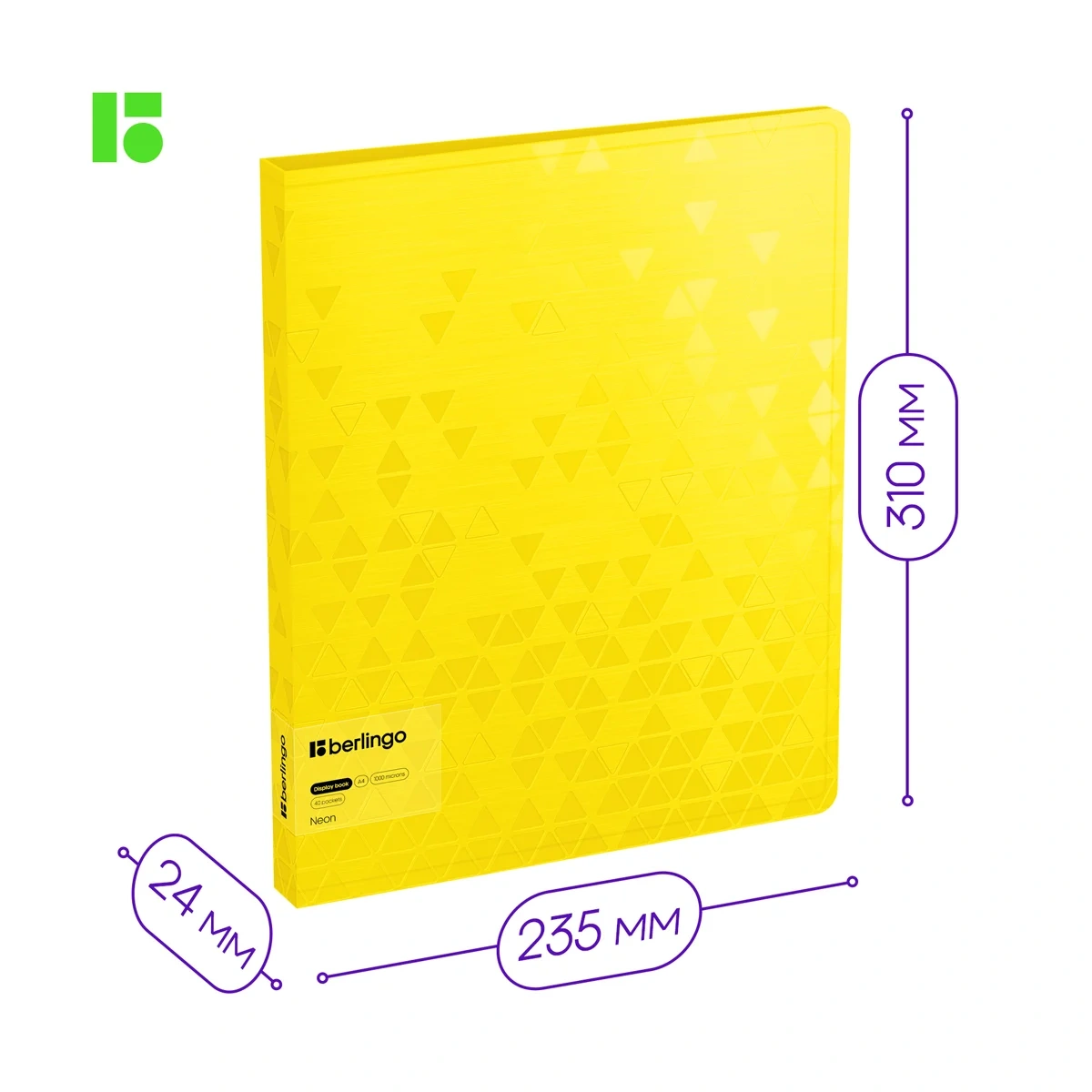 Папка Berlingo Neon с 40 вкладышами формата А4 станет ярким помощником для хранения документов. Размер изделия – 310*235*24 мм, ширина корешка – 24 мм, толщина материала – 1000 мкм. Папка вмещает до 100 бумажных листов. Листы-карманы увеличенной толщины 30 мкм надежно скреплены сваркой. Папка неонового жёлтого цвета изготовлена из высококачественного полипропилена с матовой текстурой поверхности «рельефные треугольники», на которой не видно отпечатков пальцев и мелких царапин. Внутренняя сторона оснащена плотным прозрачным карманом для удобного хранения мелочей: ручки, заметок, визиток, дисков, флешек и другого. Упакована в индивидуальный прозрачный пакет