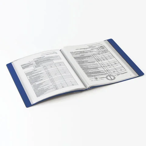 Для маркировки содержимого на корешок наклеена этикетка. Папка изготовлена из качественного пластика толщиной 0,8 мм с антибликовой фактурой, а ширина корешка составляет 53 мм. Содержит 80 вкладышей, позволяющих хранить документы формата А4 и обеспечивающих их надежную защиту от попадания влаги, пыли и прочих повреждений.
