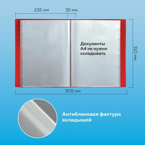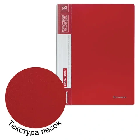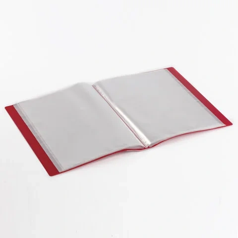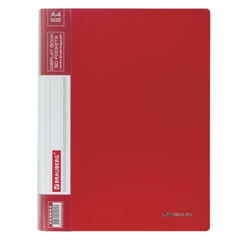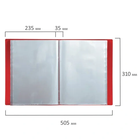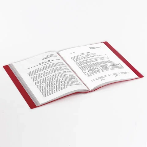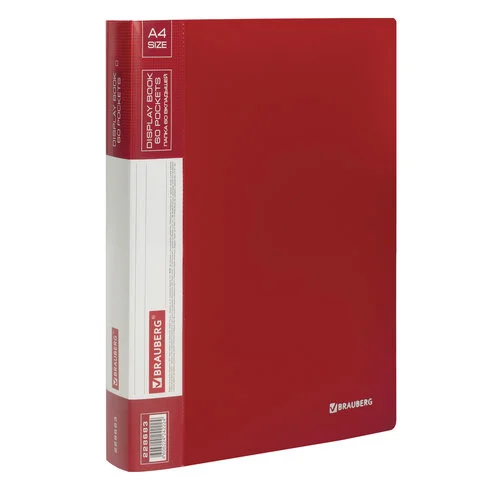 Изготовлена из качественного пластика толщиной 0,8 мм. Содержит 60 вкладышей формата А4. Также для идентификации содержимого имеется карман на корешке для сменной этикетки. Выполнена в современном привлекательном дизайне с антибликовой фактурой 'Стандарт' красного цвета.