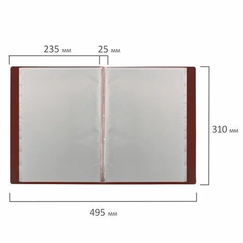 Для маркировки содержимого на корешок наклеена этикетка. Папка изготовлена из качественного пластика толщиной 0,6 мм с антибликовой фактурой, а ширина корешка составляет 25 мм. Содержит 40 вкладышей, позволяющих хранить документы формата А4 и обеспечивающих их надежную защиту от попадания влаги, пыли и прочих повреждений.