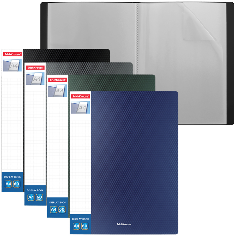 Папка файловая формата А4 из высококачественного пластика с текстурой поверхности 'даймонд', на которой не видно отпечатков пальцев и мелких царапин. Предназначена для хранения и просмотра документов. Папка содержит 60 прозрачных листов-карманов, надежно скрепленных сваркой. Карман на корешке папки предназначен для информационной карточки. Цвет папки – ассорти: черный, синий, зеленый, серый. Папка вмещает до 100 бумажных листов.