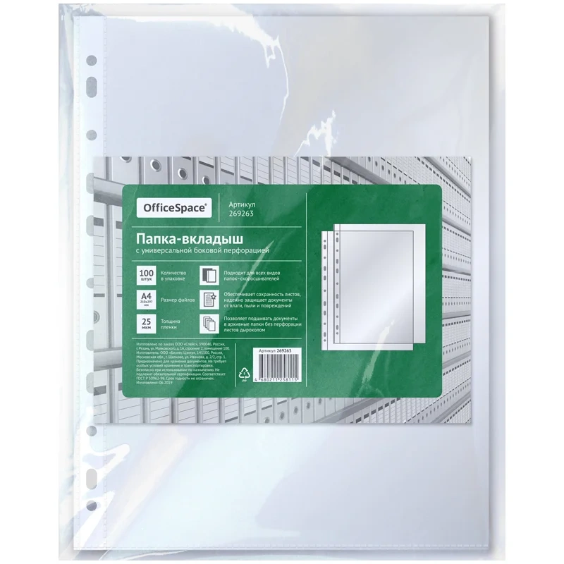 Матовые прозрачные файлы-вкладыши OfficeSpace формата А4 размера 305*233 мм предназначены для хранения неперфорированных документов А4 в любых папках с кольцевым механизмом и скоросшивателем, и позволяют систематизировать и обеспечить сохранность документов. Вертикальная ориентация, толщина пленки 25 мкм. В упаковке 100 штук. Антибликовая фактура«апельсиновая корка» позволяет копировать документы, не вынимая их из папки. Яркий информационный вкладыш в каждой групповой упаковке.Оптимальное решение для государственных учреждений, банков и офисов коммерческих предприятий.