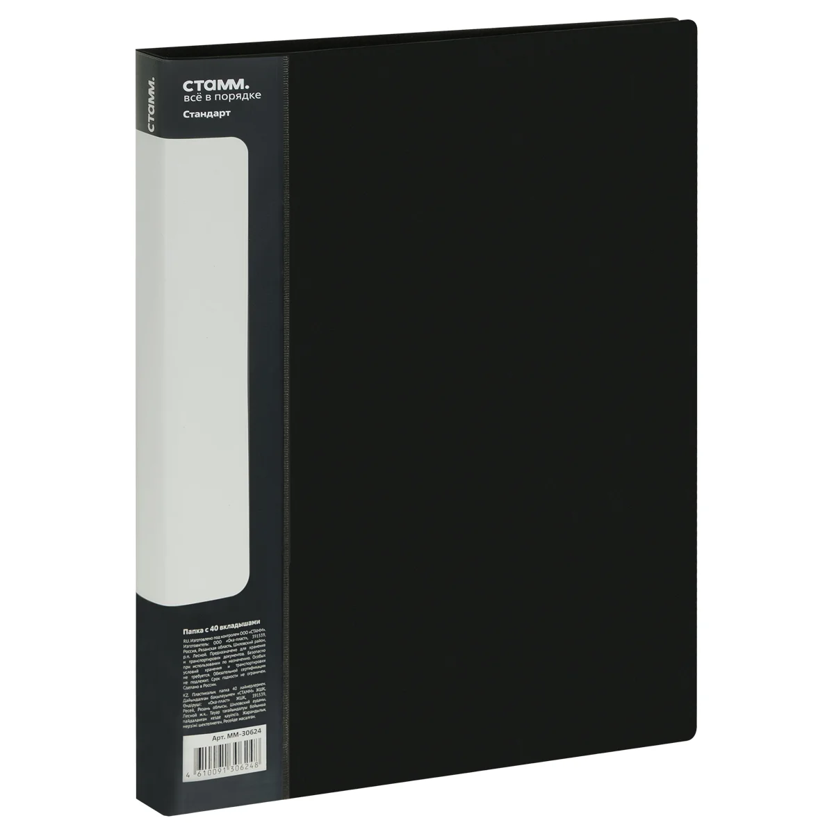 Папка с 40 вкладышами «СТАММ» серии «Стандарт» предназначена для хранения бумаг формата А4. Цвет папки – чёрный. Папка изготовлена из качественного полипропилена толщиной 600 мкм с текстурой «песок». Тип скрепления – термосварка. Размер изделия составляет 310*235 мм. Ширина корешка – 21 мм. Бумагам, вложенным в папку, не требуется перфорация дыроколом. На корешке папки имеется карман. Папка упакована в индивидуальный пакет.