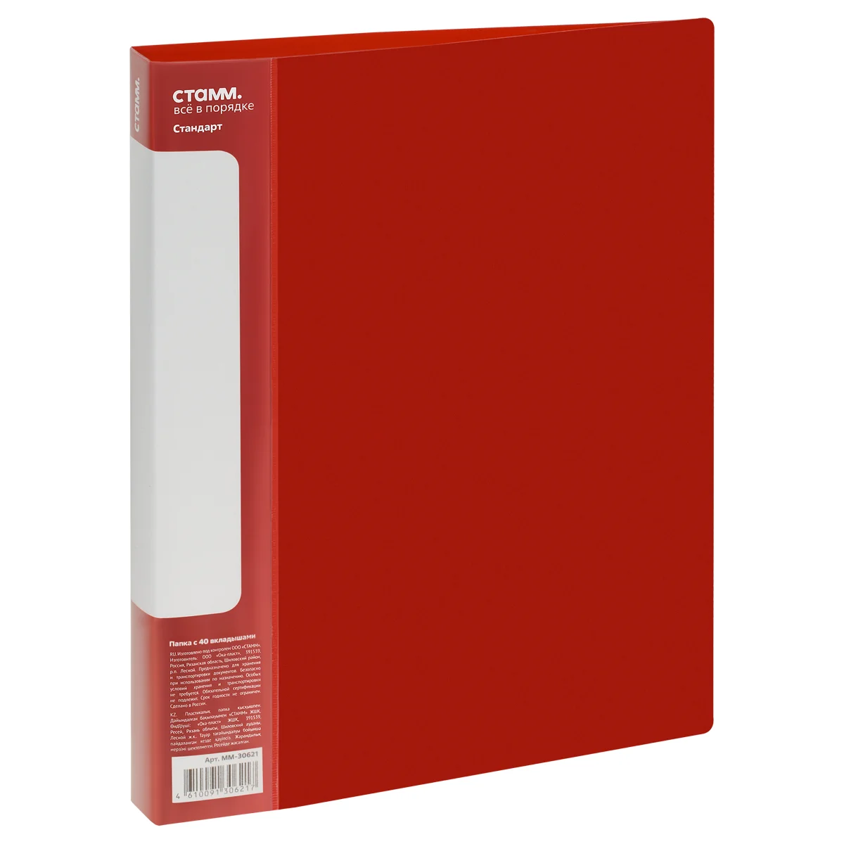 Папка с 40 вкладышами СТАММ «Стандарт» – отличный помощник для хранения бумаг формата А4. Размер изделия составляет 310*235 мм. Ширина корешка – 21 мм. Папка красного цвета изготовлена из качественного полипропилена толщиной 600 мкм с текстурой «песок». Тип скрепления – термосварка. Бумагам, вложенным в папку, не требуется перфорация дыроколом. На корешке папки есть удобный карман. Папка упакована в индивидуальный пакет.