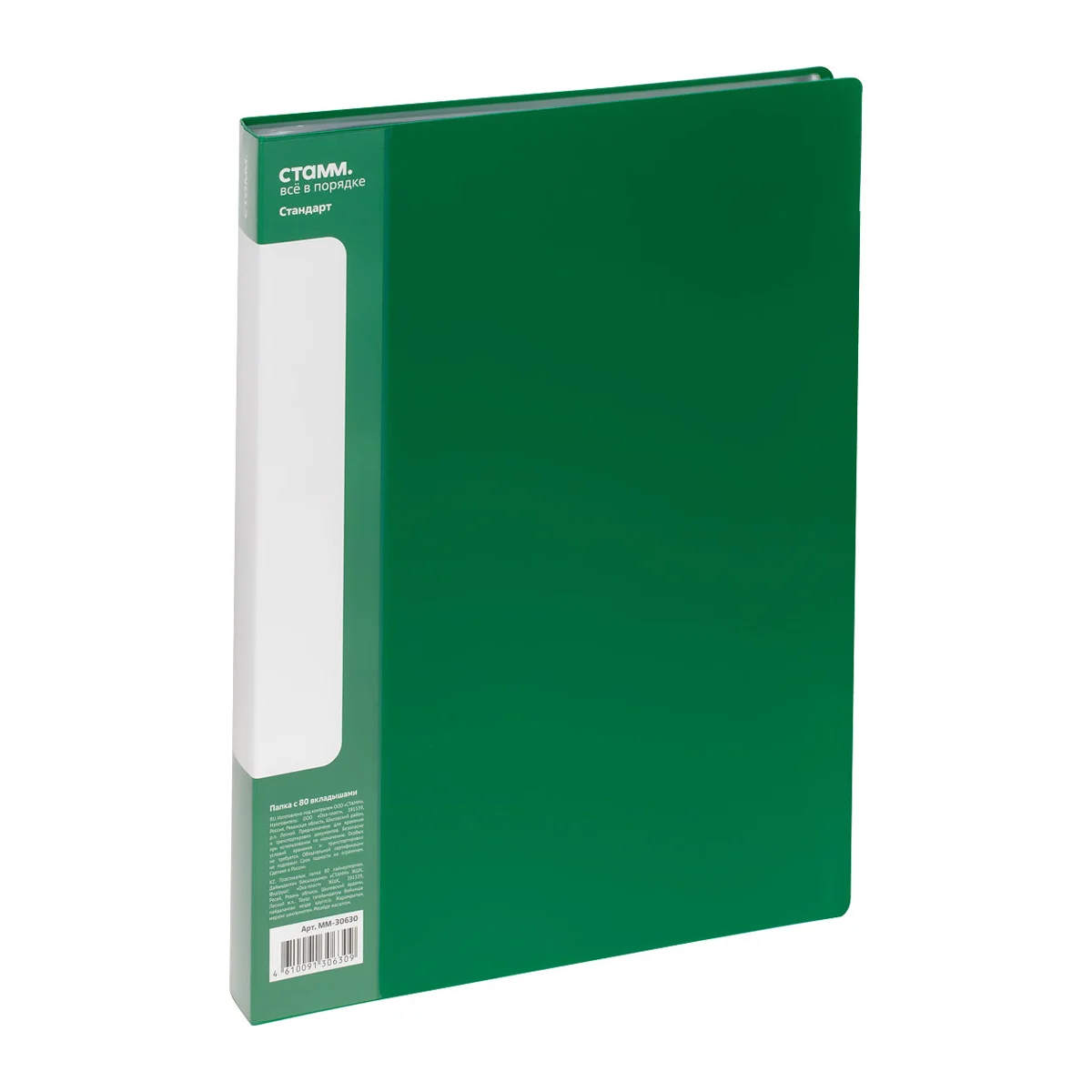 Папка с 80 вкладышами «СТАММ» серии «Стандарт» предназначена для хранения бумаг формата А4. Цвет папки – зелёный. Папка изготовлена из качественного полипропилена толщиной 800 мкм с текстурой «песок». Тип скрепления – термосварка. Размер изделия составляет 310*235 мм. Ширина корешка – 30 мм. Бумагам, вложенным в папку, не требуется перфорация дыроколом. На корешке папки имеется карман. Папка упакована в индивидуальный пакет.