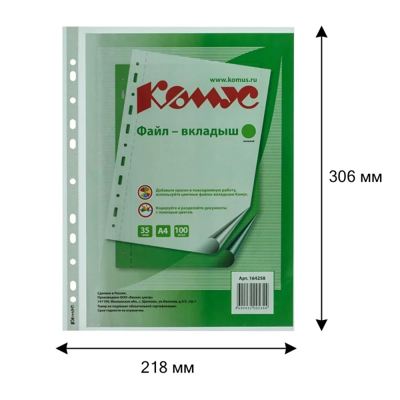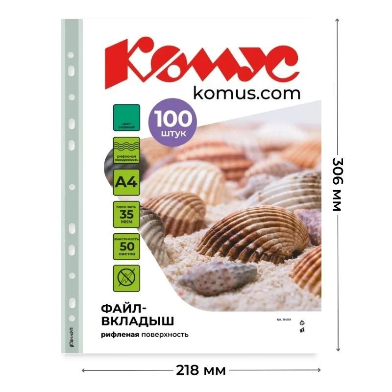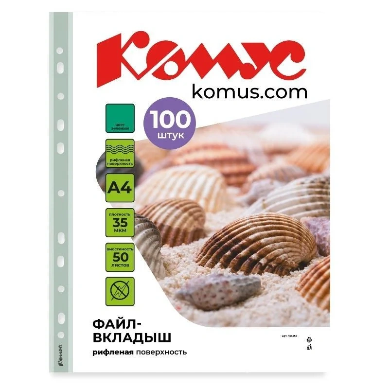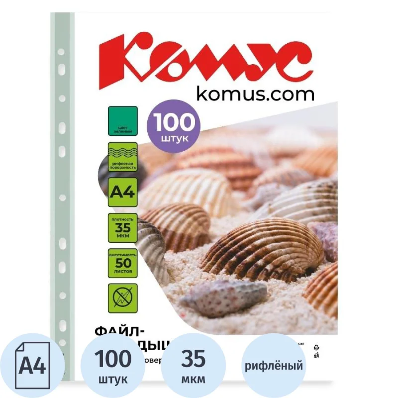 Файл-вкладыш ?Комус? формата А4 предназначен для хранения и защиты документов. Изготовлен из полипропиленовой пленки зеленого цвета (толщина 35 мкм). Внутренний размер 306х218 мм. Имеет прозрачную рифленую поверхность. Боковая универсальная перфорация подходит для разных типов скоросшивателей. В упаковке содержится 100 файлов. Каждый файл-вкладыш вмещает до 50 листов стандартной плотности. Стоимость указана за упаковку. В рамках обновления дизайна упаковки с сохранением всех потребительских характеристик товара, допускается поставка данной продукции в двух вариантах дизайна упаковки.