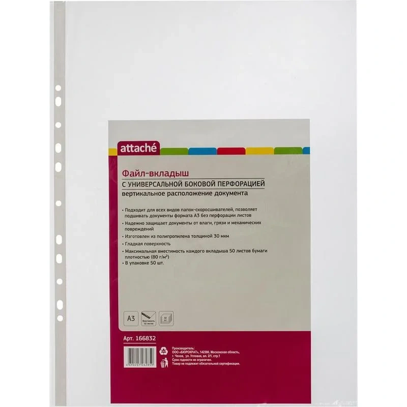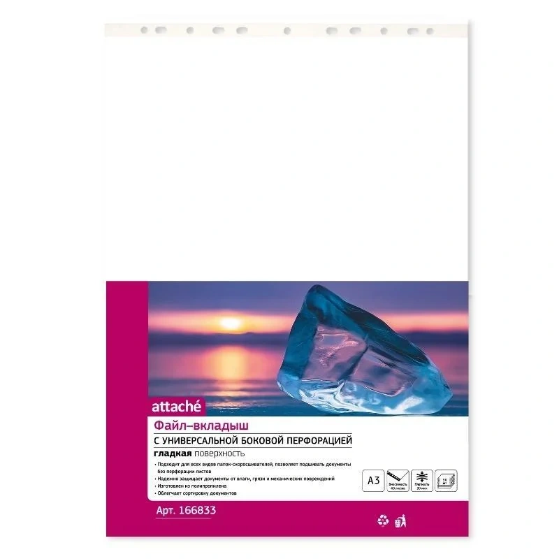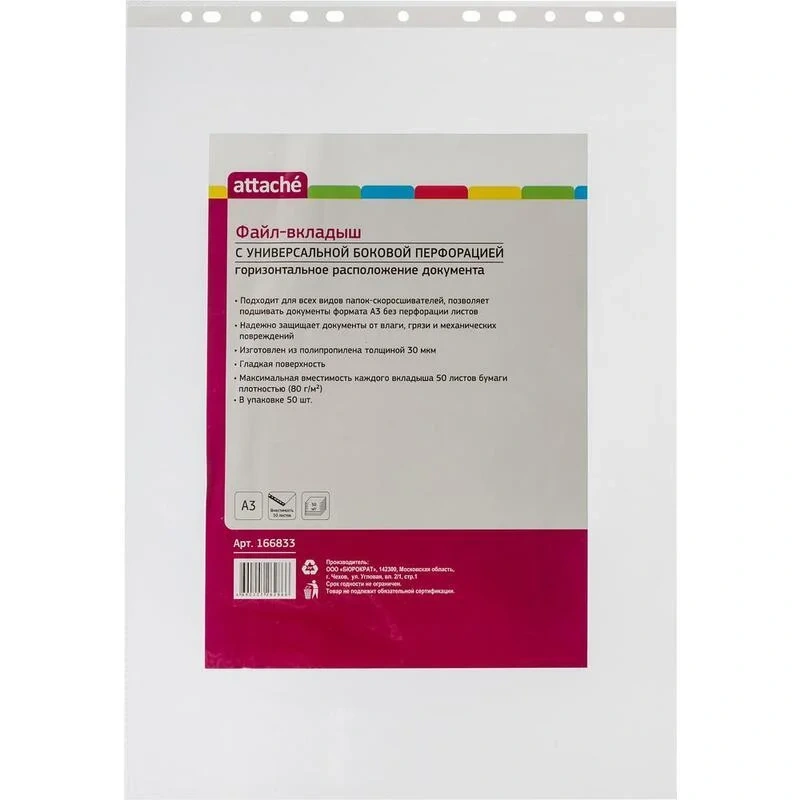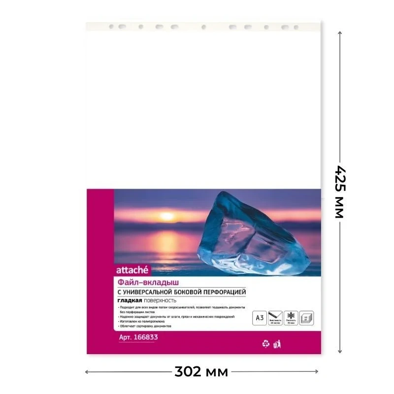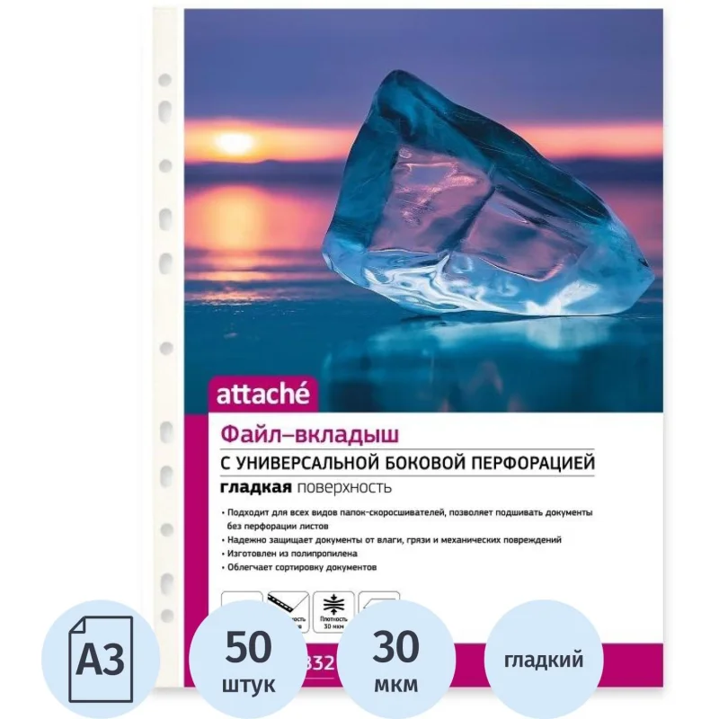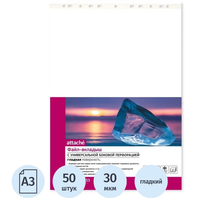 Файл-вкладыш А3 Attache 30мкм 50шт/уп, прозрачный, гладкий, без перфорации